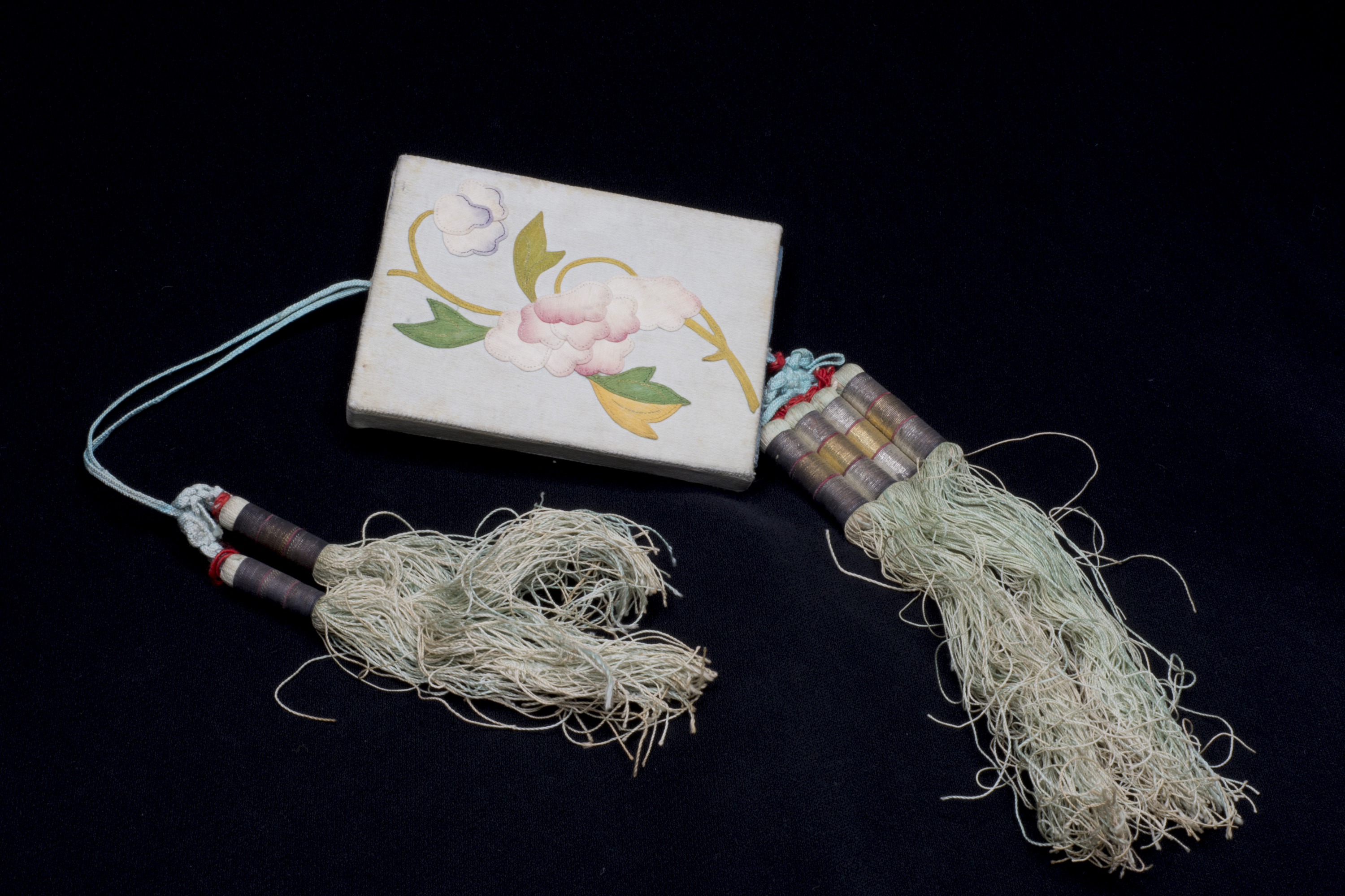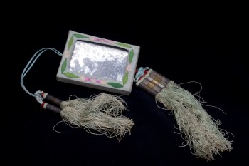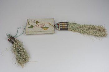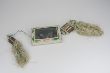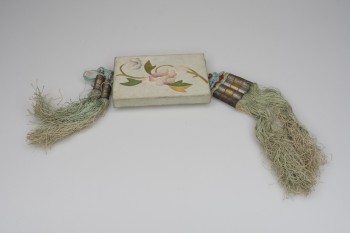 Silk covered vanity or card case with mirror. Pale blue silk with embroidery and tassles at either side.