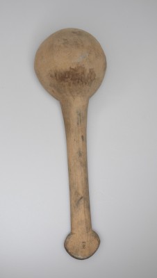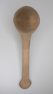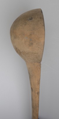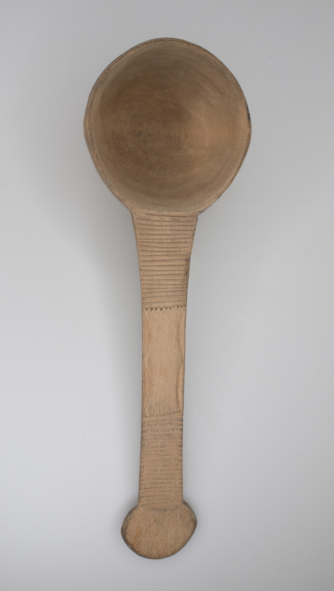 Large wooden carved spoon from the Niger. Taken back from the Niger by William Balfour Baikie. Pale wood with a ladle depth bowl. Serving spoon. Geometric carved pattern on handle.
