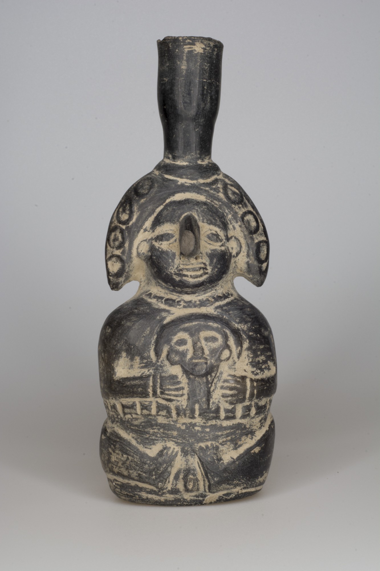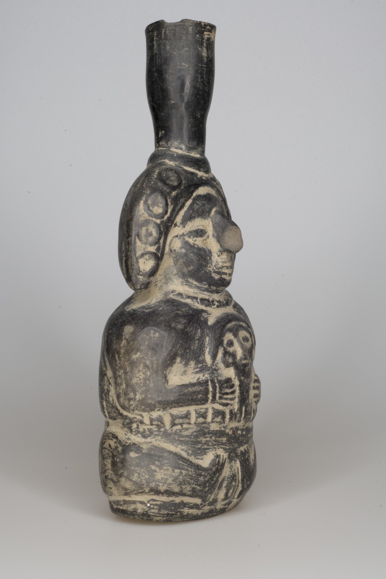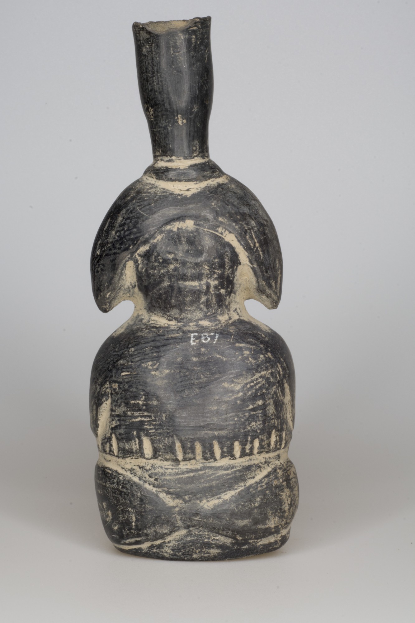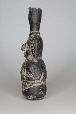 Original catalogue entry: Guaca or water-jar in the form of a seated human figure. Black pottery Maya Grave Update 26/8/1983: