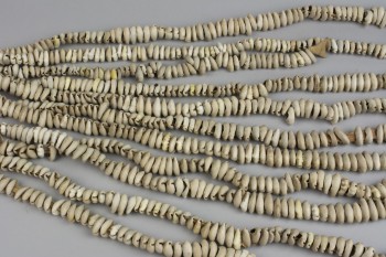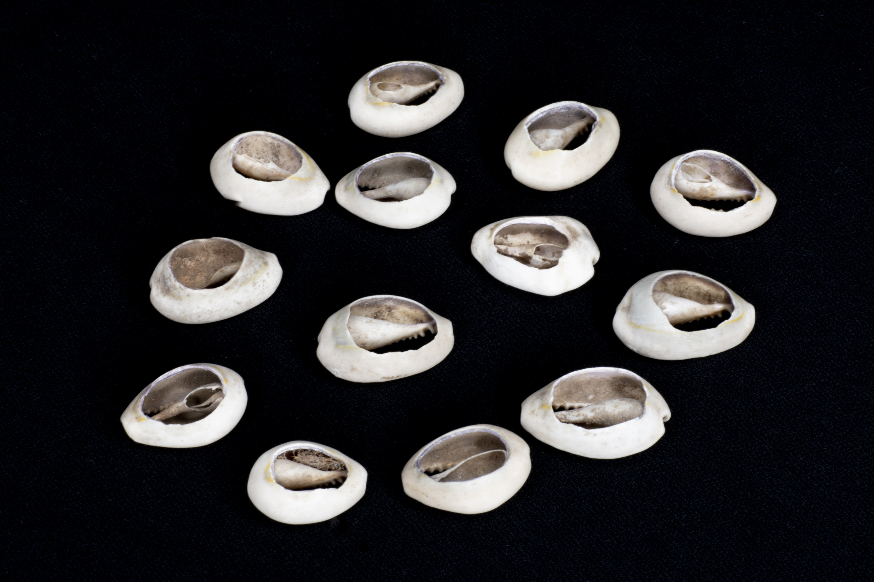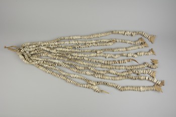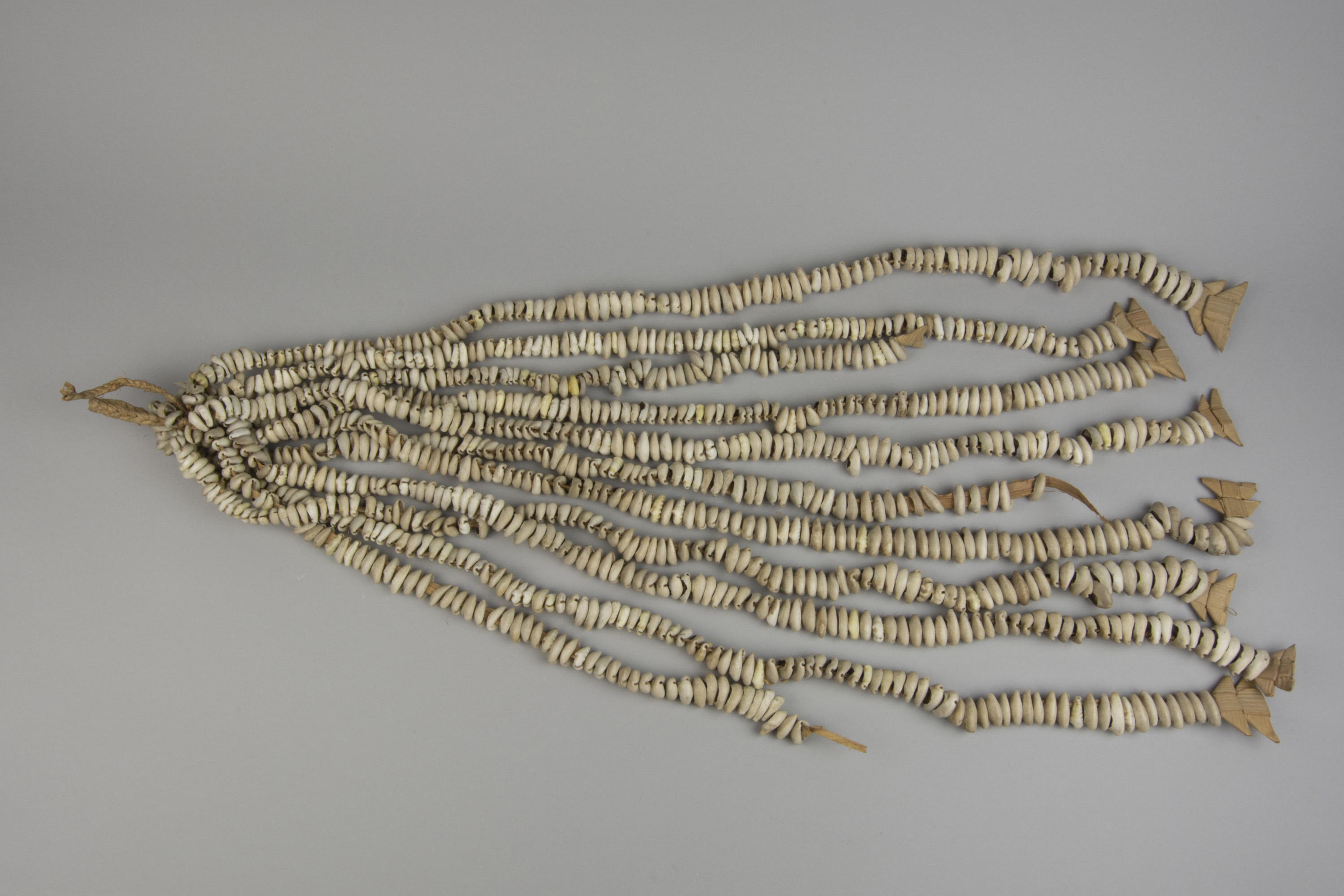 Eleven strings of cowrie shellls. 'A Queen's Offering'.