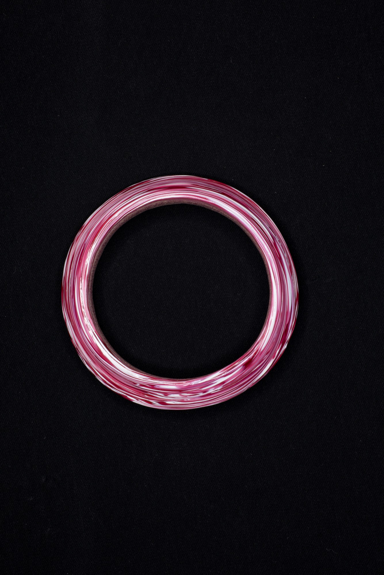 Solid red and white patterned glass armlet, or bangle. Dull on the inside but shiny on the outside, which is tapered towards the edges.