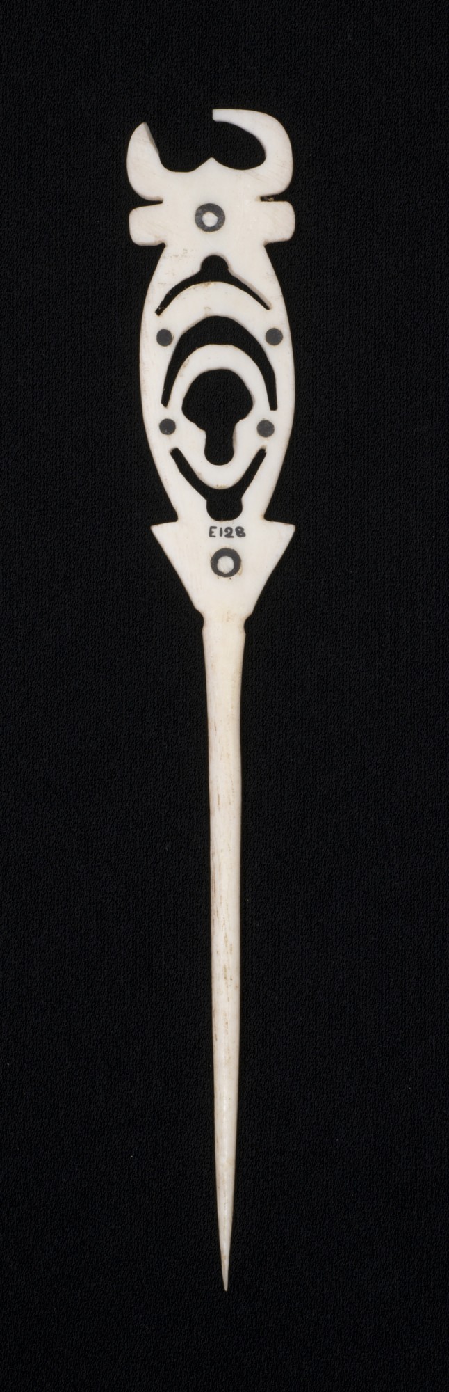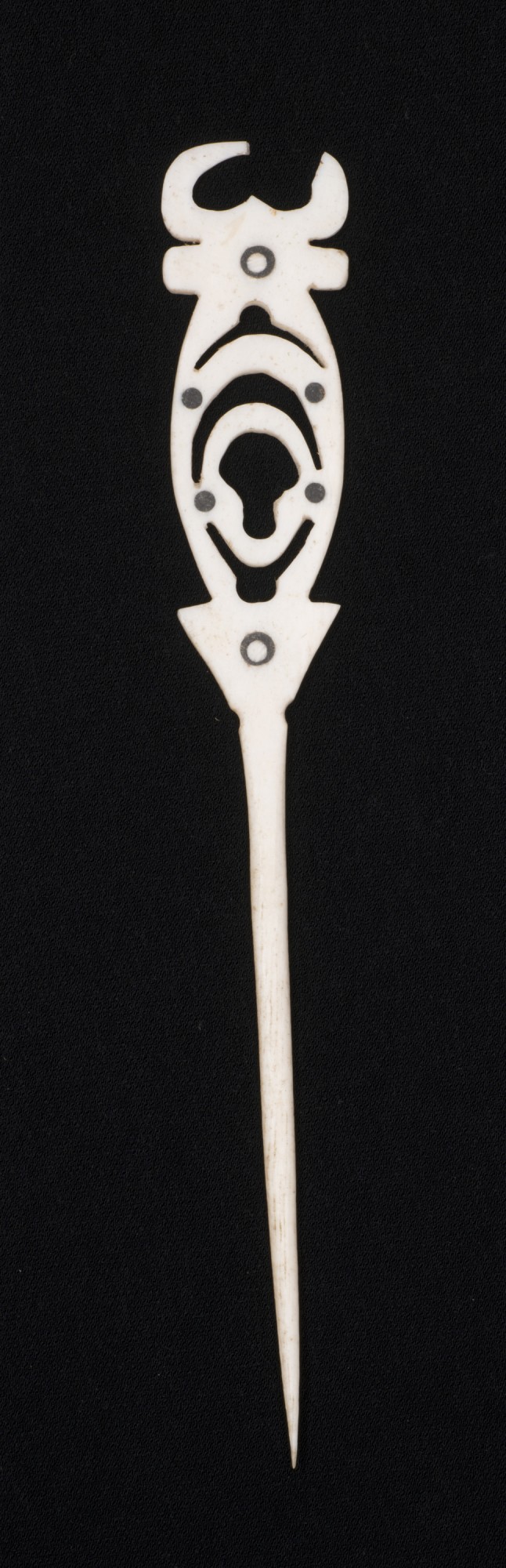 White hairpin with dark circular decoration. The top of the pin is pierece fretwork. The top is broked so it is difficult to determine the whole design. Abstract geometric. Made from Hippo tooth.