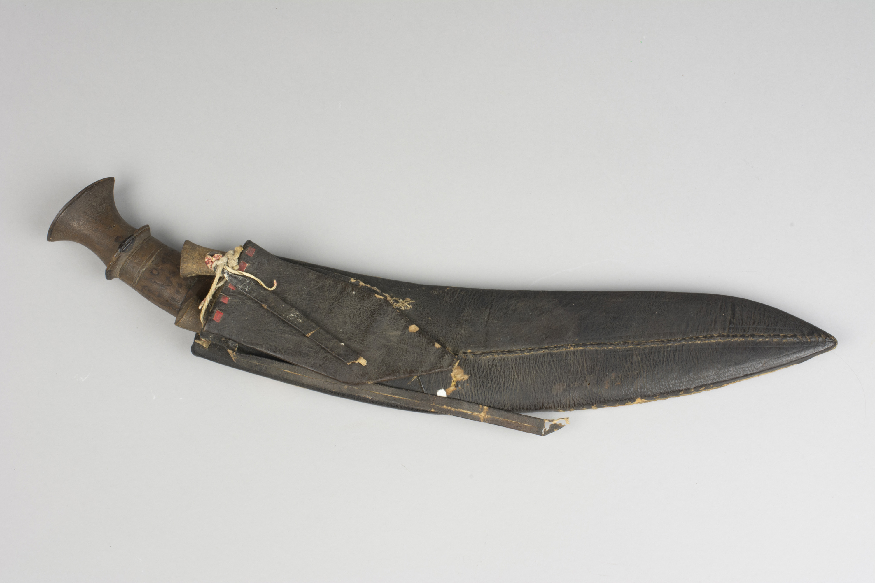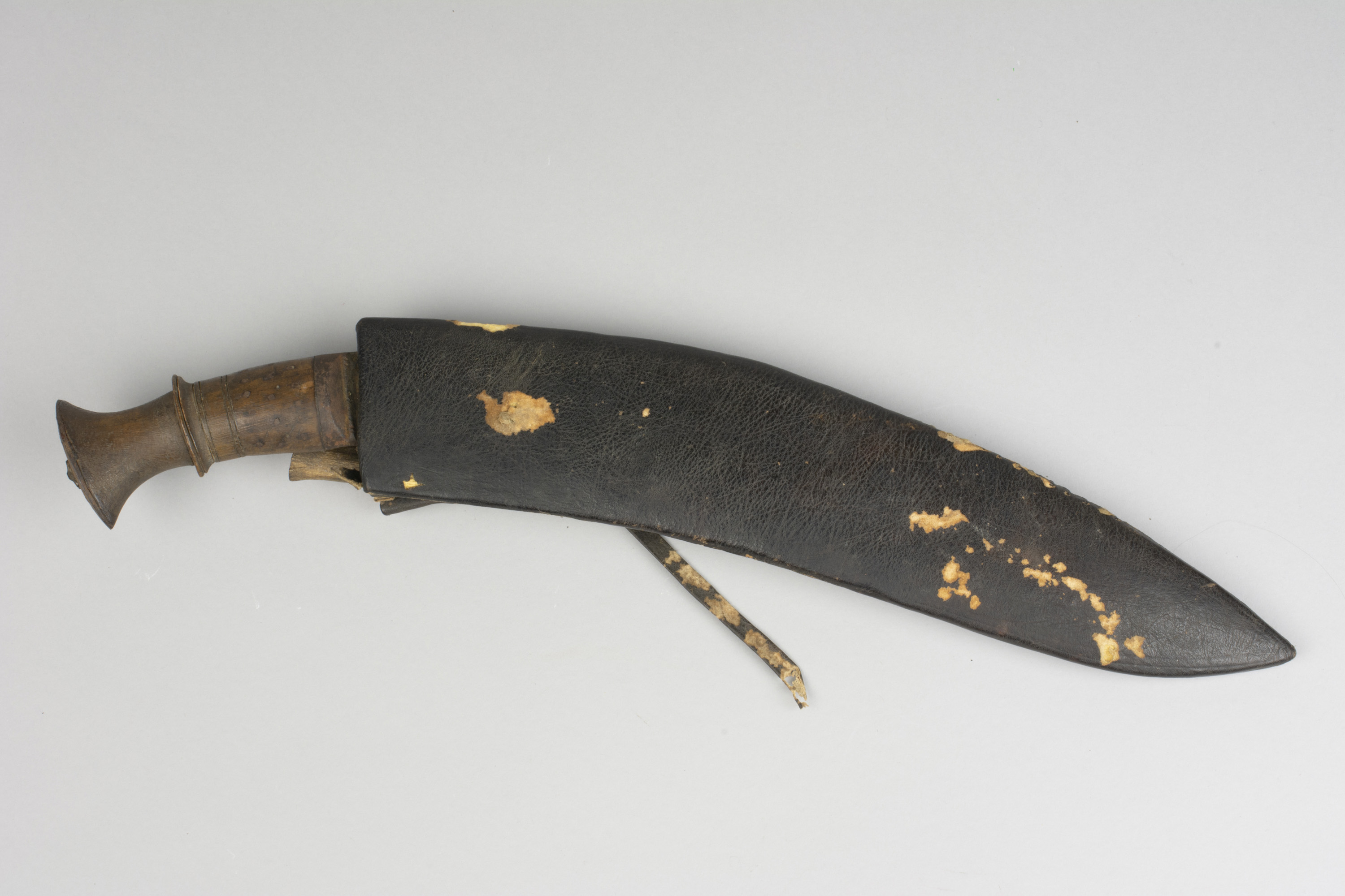 Gurkha's kukri knife and two small knives in wood and leather sheath.