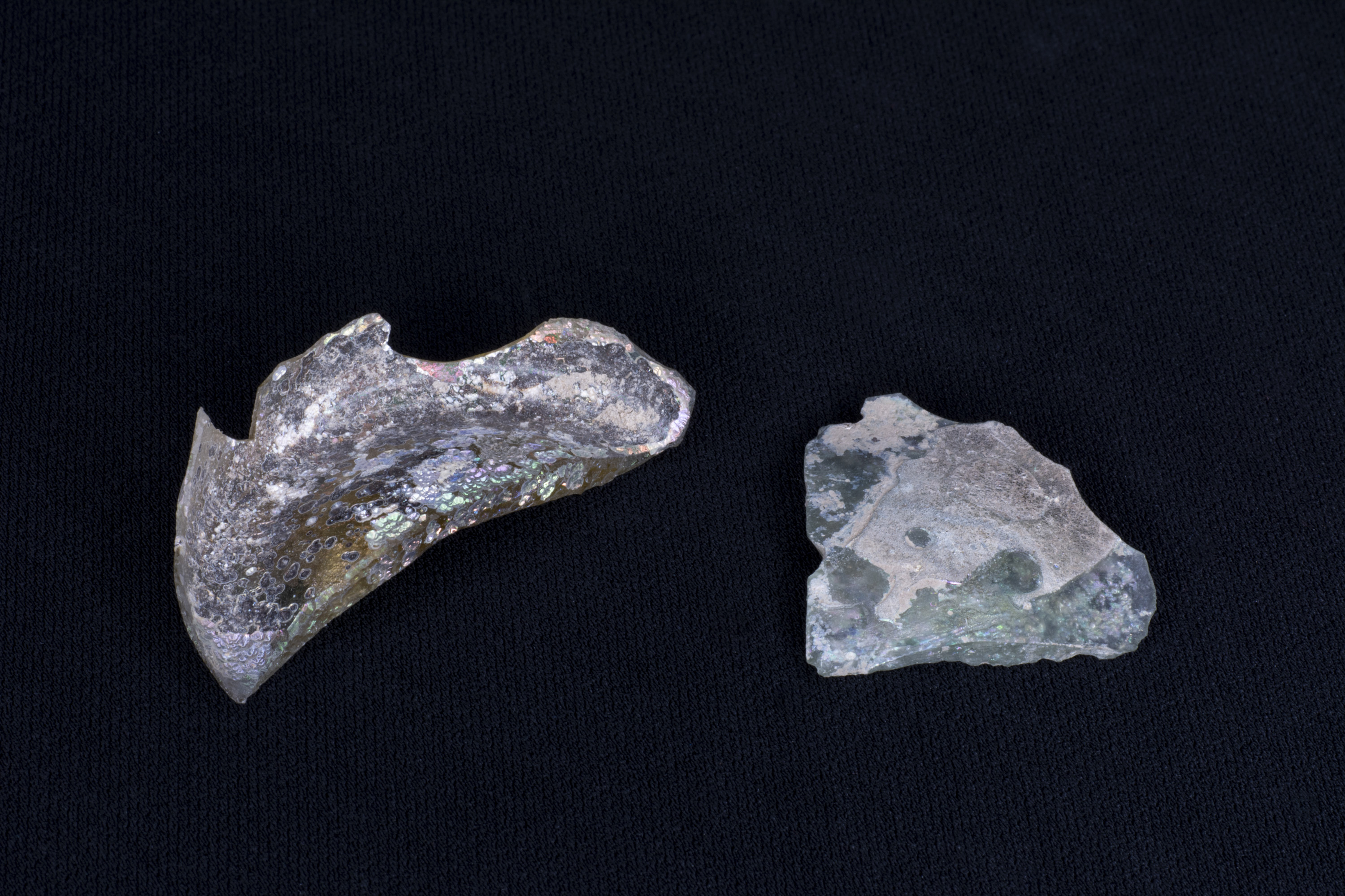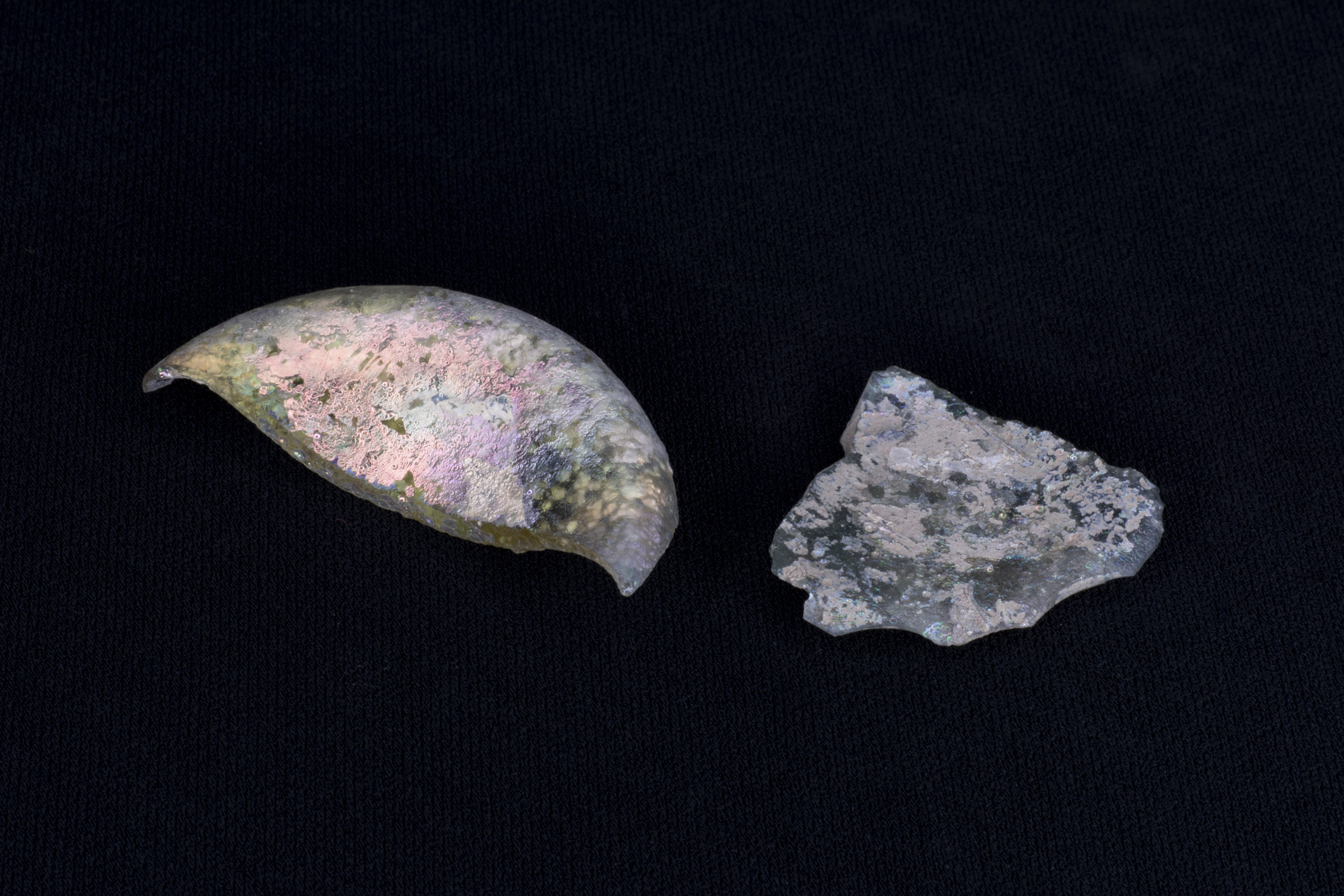 Two fragments of Roman glass. Found at Carthage, North Africa.