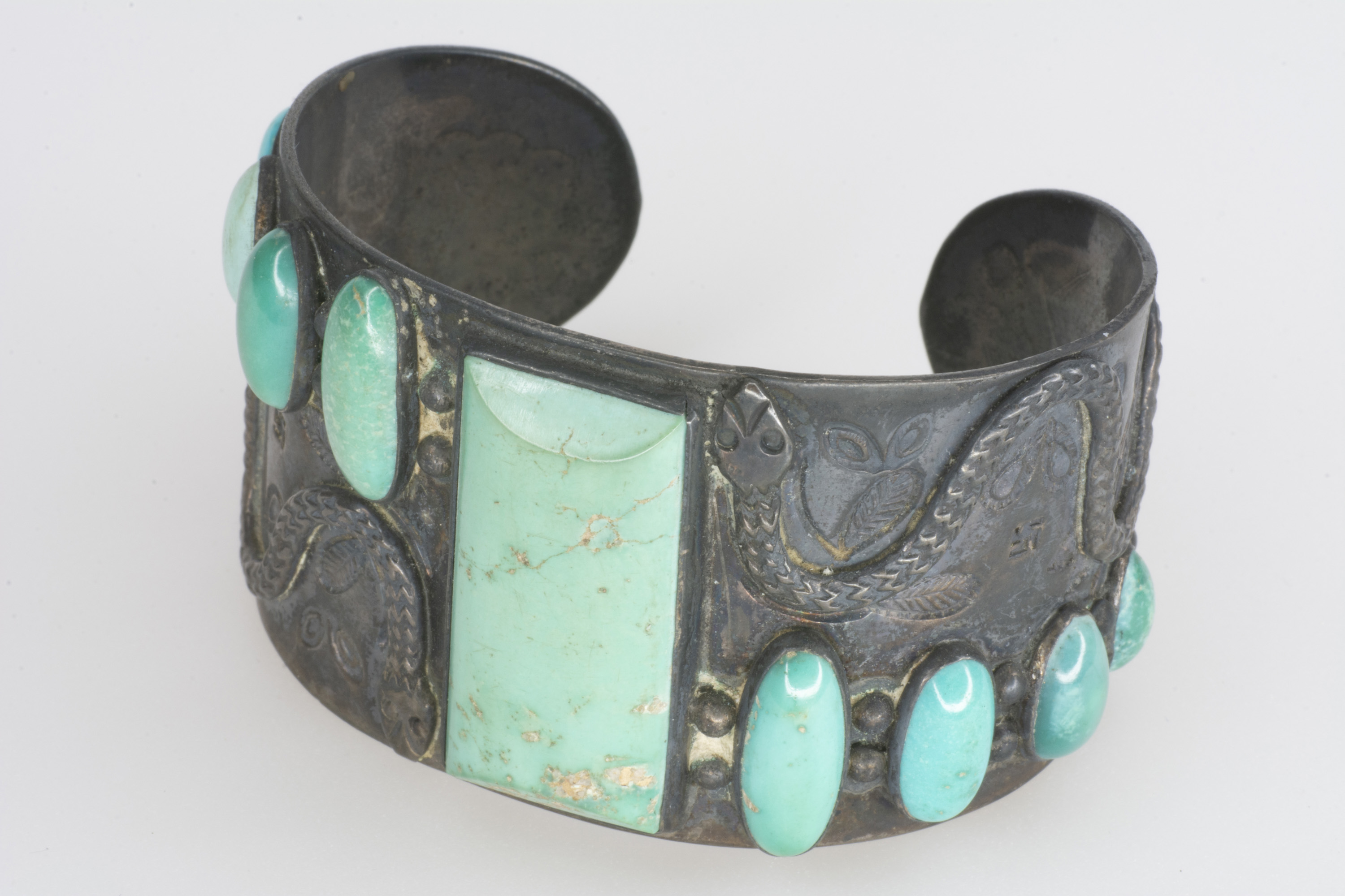 Silver bracelet with 9 turquoise stones. Thought to be Navajo.