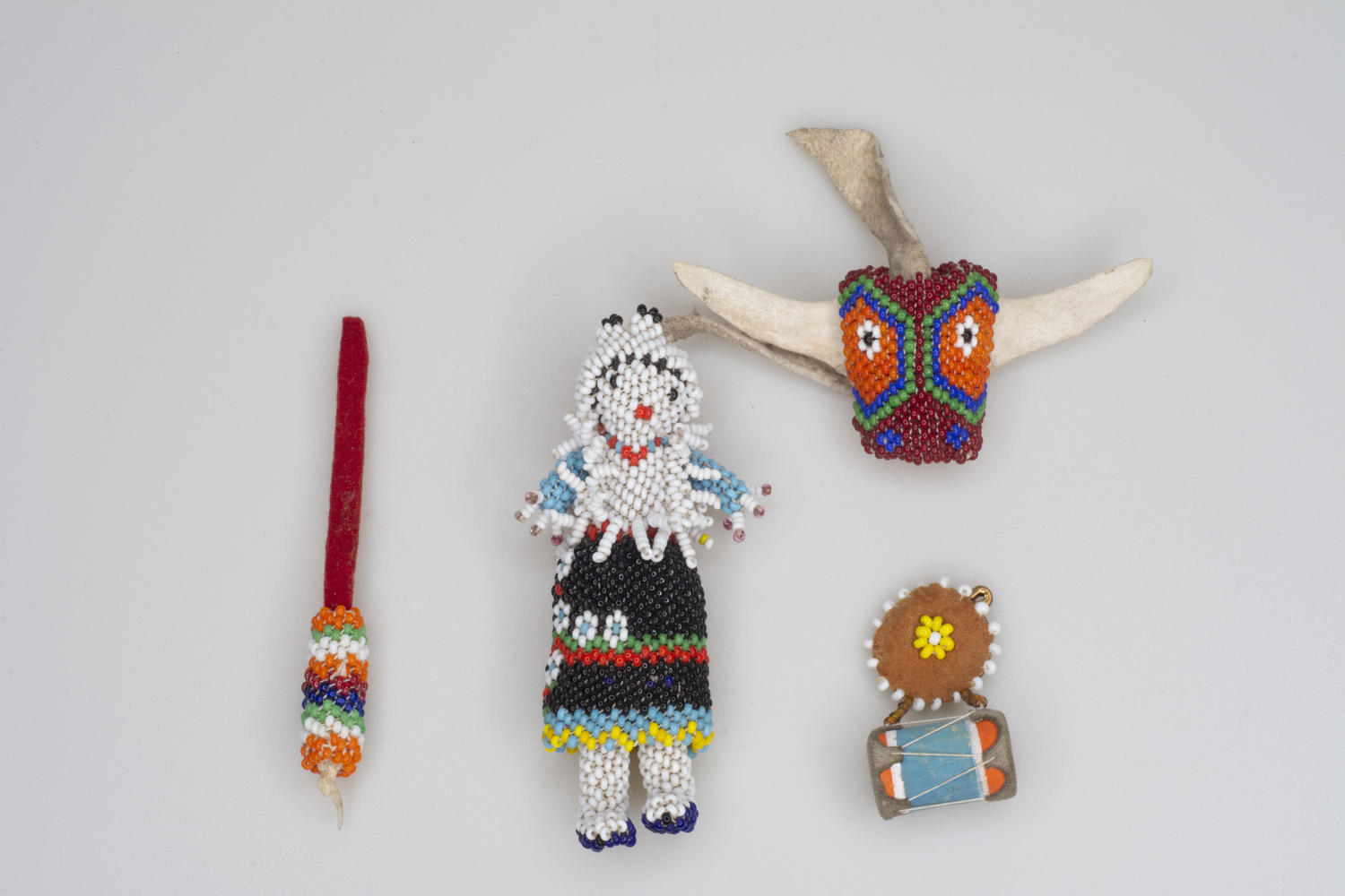 Beadwork doll with buffalo head, "spear", and drum brooch.