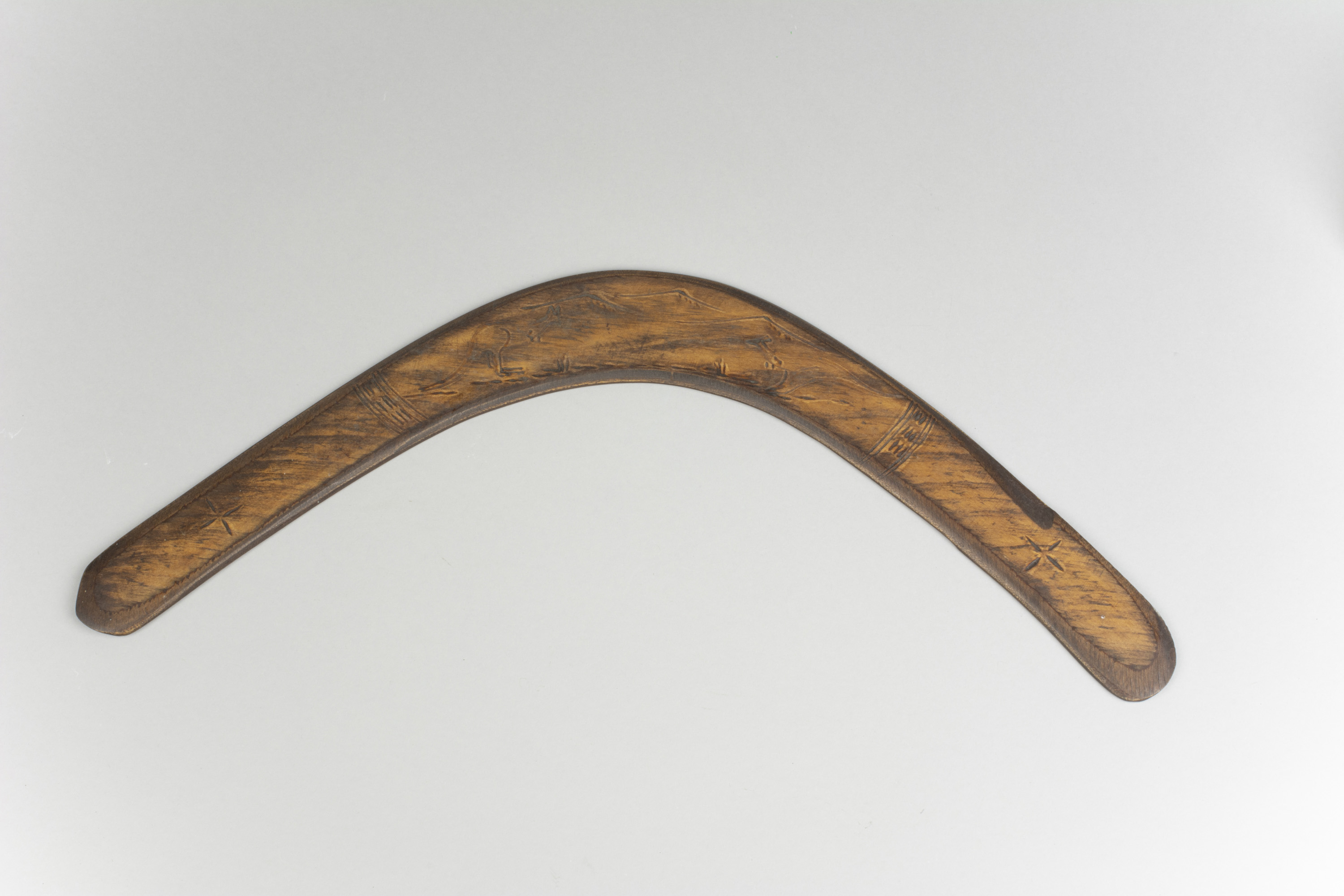 Wooden boomerang decorated with two kangaroos. Marked on back "Bushland", "Boomerangs of Australia", "Made to return".