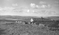 Feeding the hens in Orphir, with Hoy and Graemsay in the background. Date unknown.