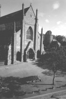 St. Magnus Cathedral, Kirkwall, date unknown. The tower of the Bishop's Palace is in the background.