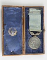 Royal National Lifeboat Institution (RNLI) silver medal awarded to coxwain Robert Leask, Stromness in 1873 for saving two people from drowning. In case