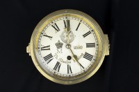 Brass wall clock with brass butterfly key (1992.5.2). Roman numerals on face. Crown stamp with "M" underneath. 2520, "Th. Staebe Elbing". Glass cover has a crack accross the front.