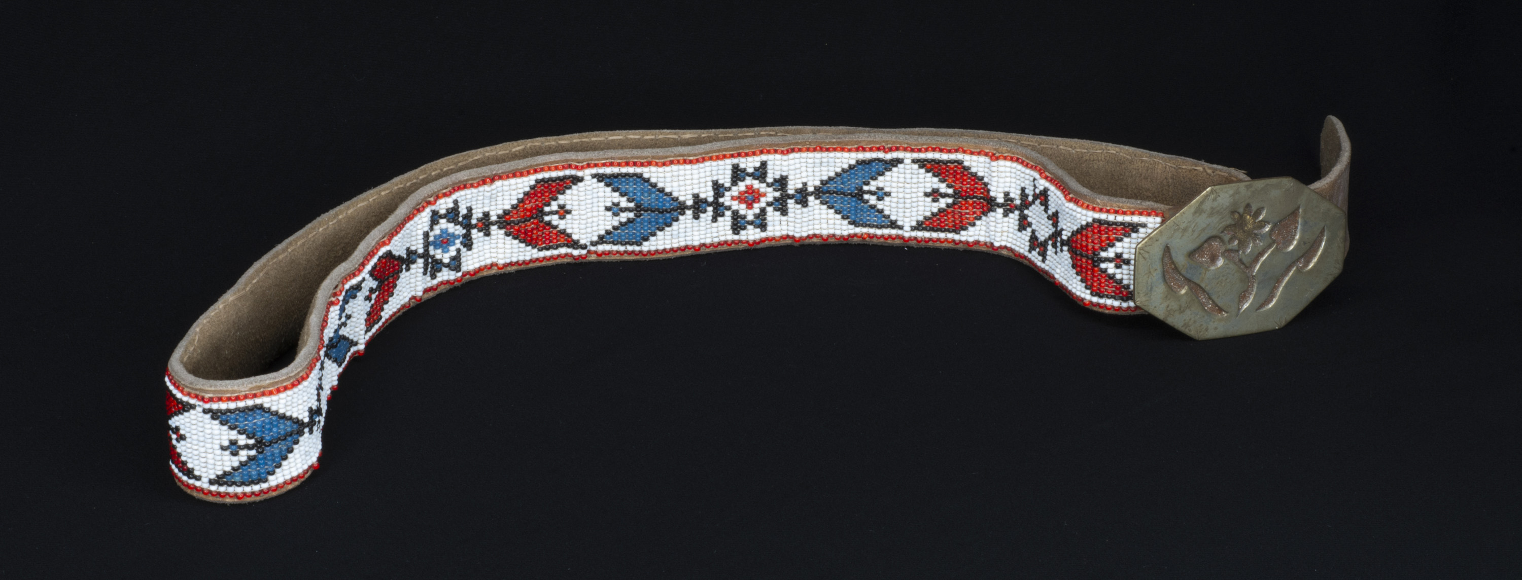 Belt of leather, covered with glass beads, metal buckle with floral design.