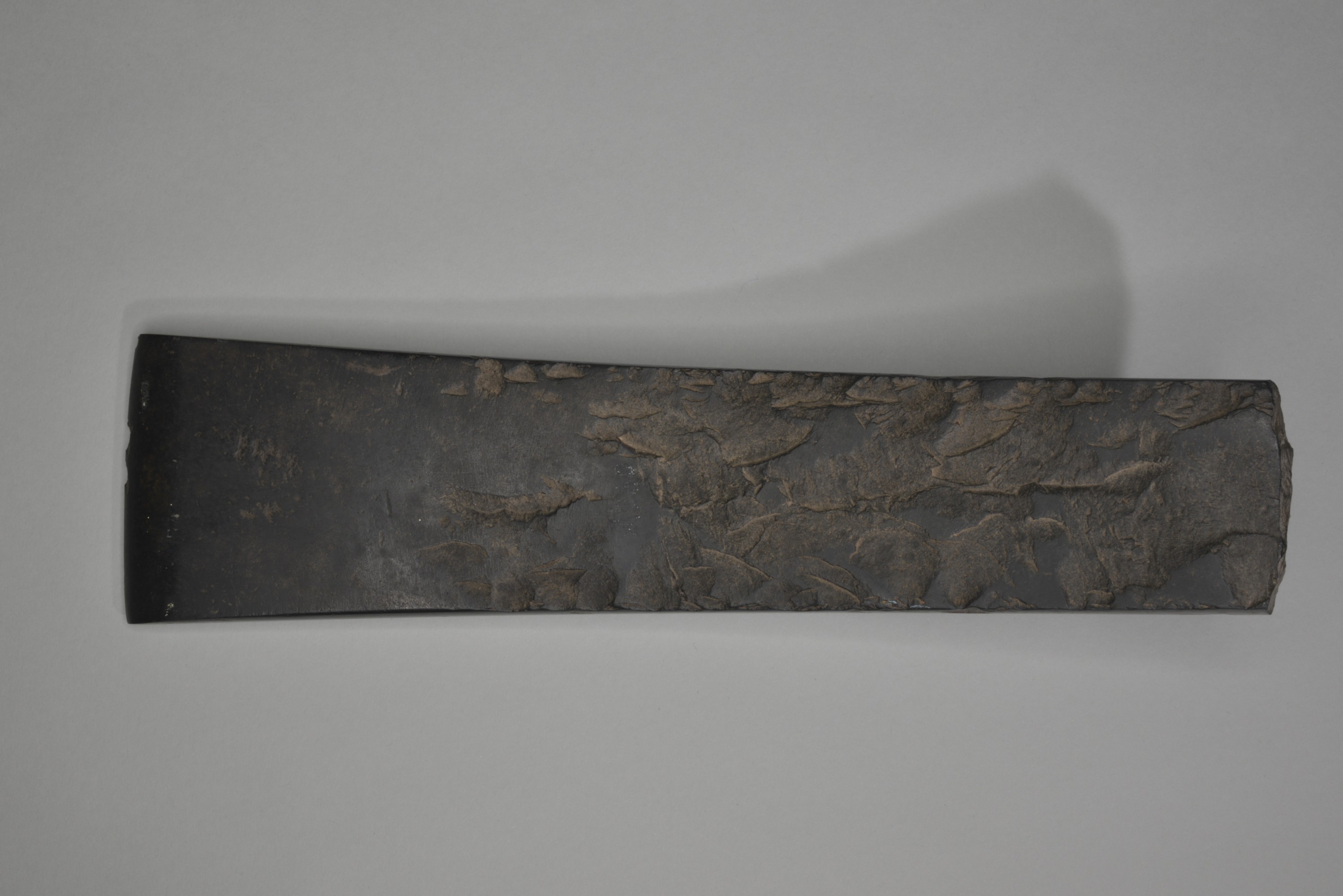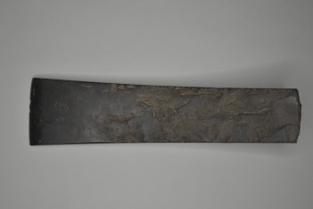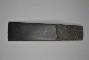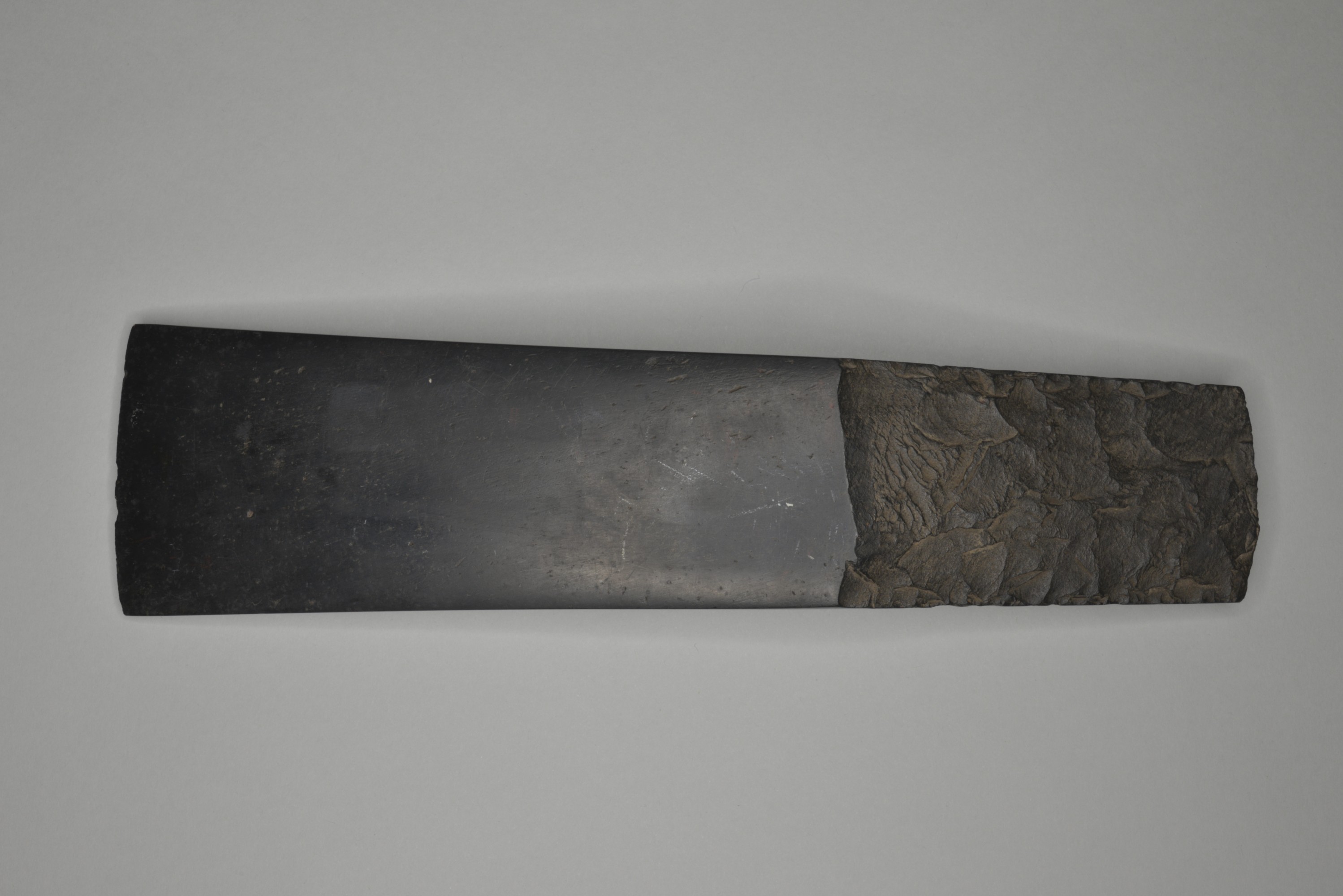 Dark stone adze blade with smooth top sides and underside. Shadow of rectangular sticky label on top? ~Occasional inclusions of reddish stone. Small chips to the blade, otherwise in good condition.