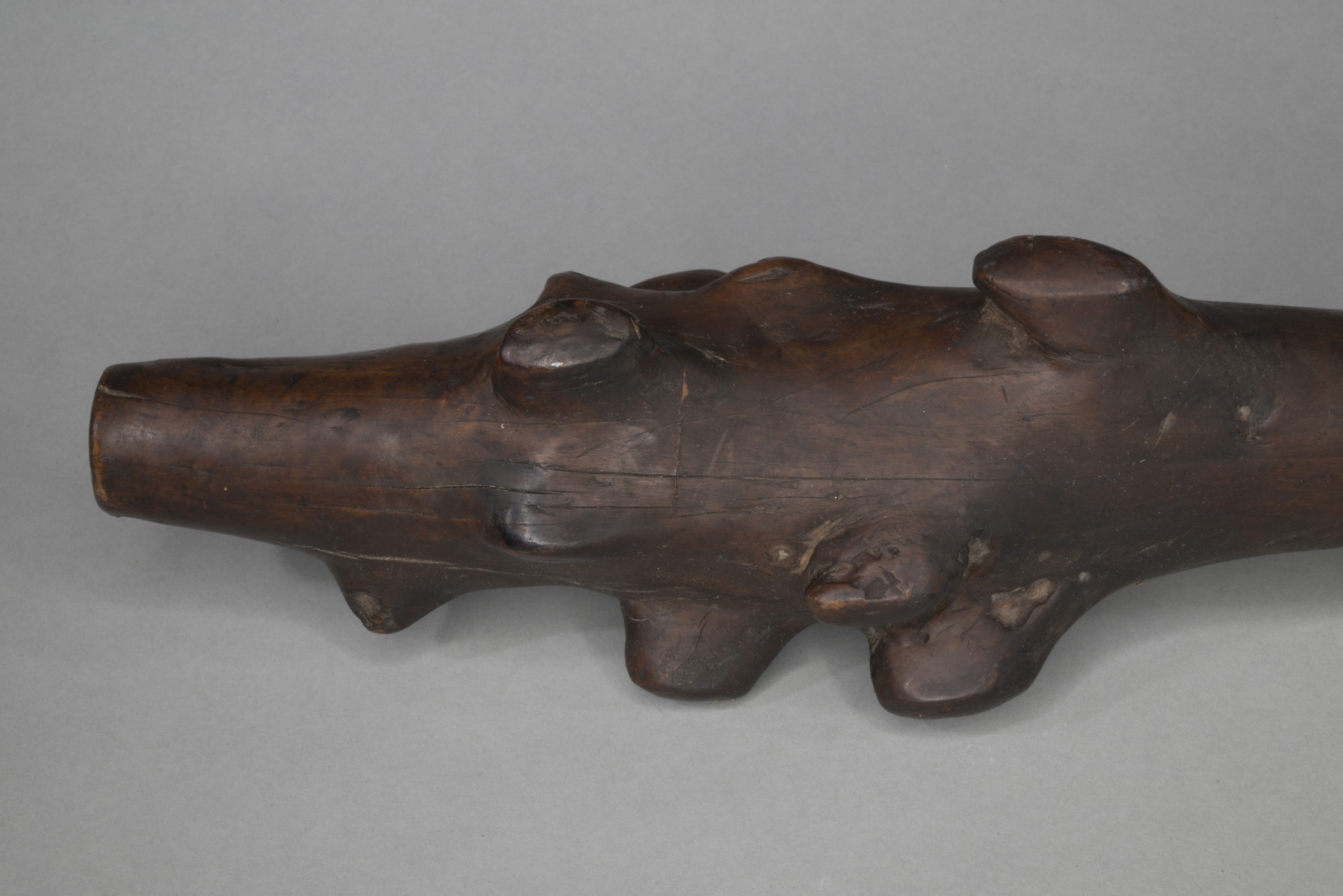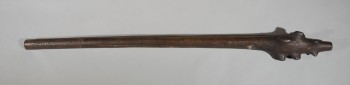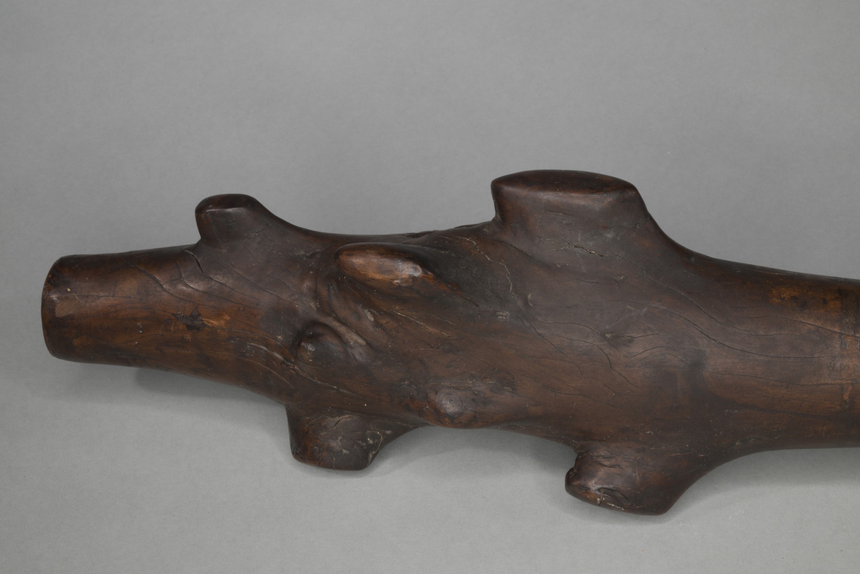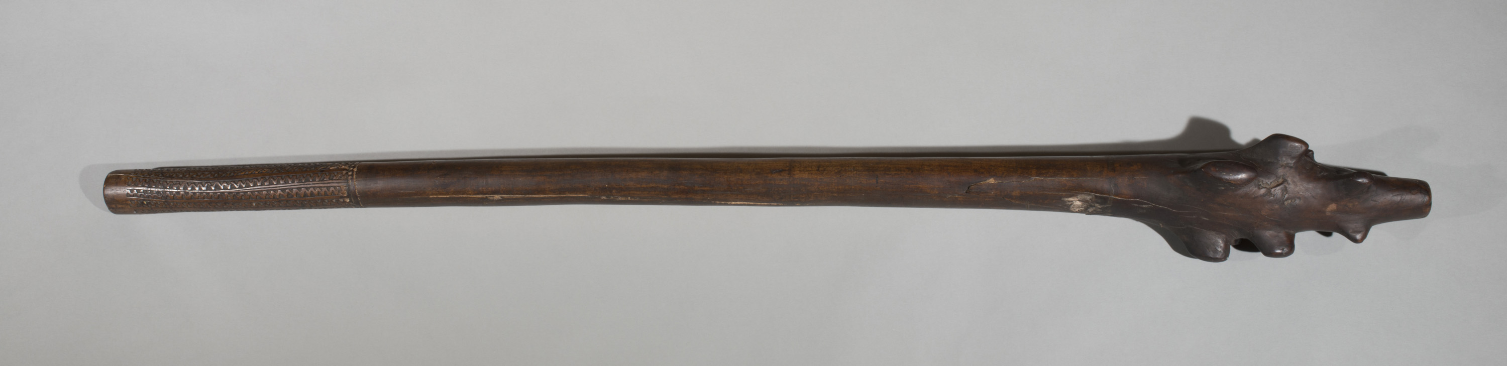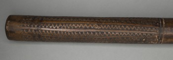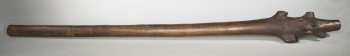 Rootstock club from Fiji. Engraving at bottom of handle: zigzag and vertical lines. Split and some cracks on one side near head.
