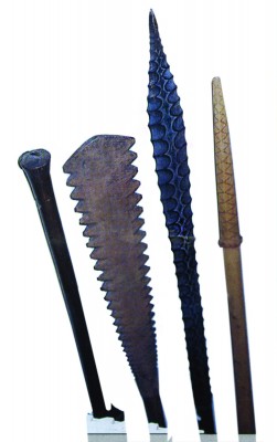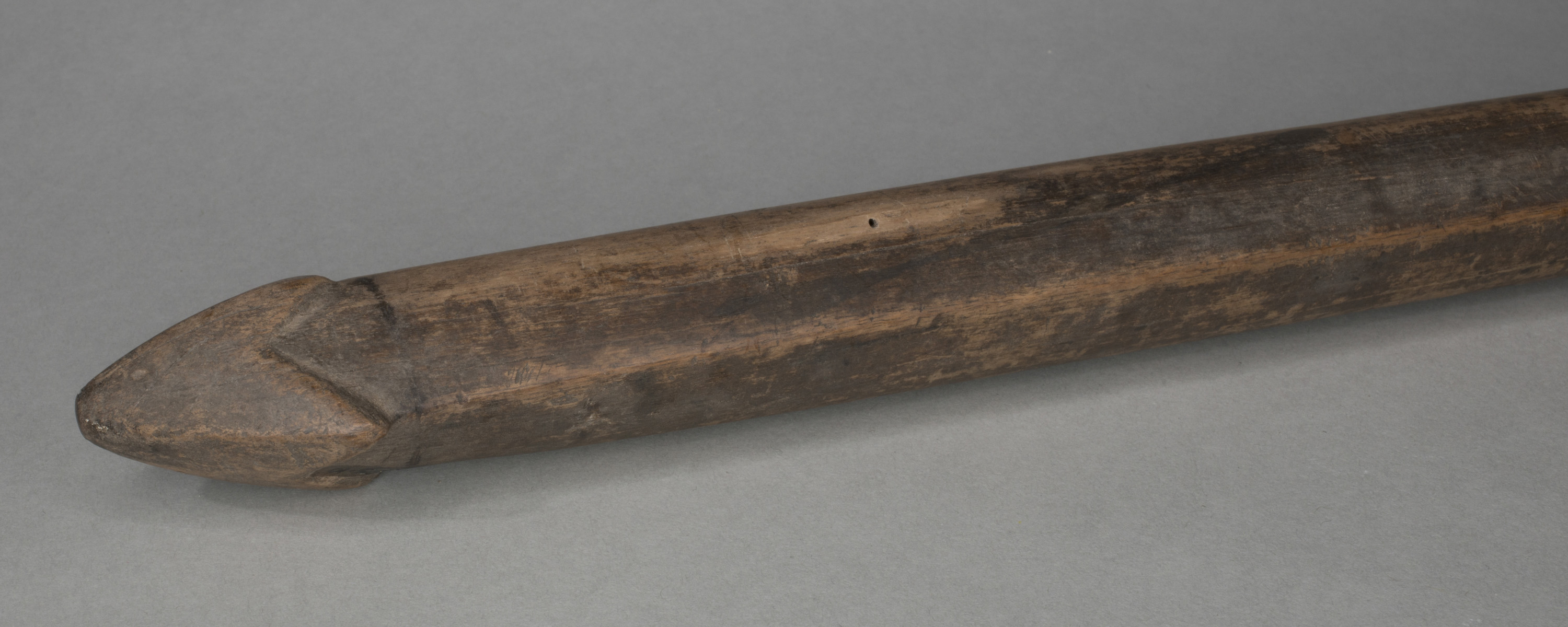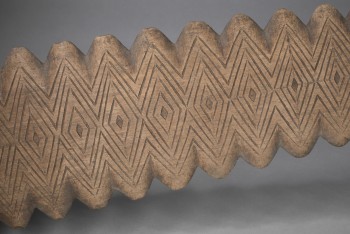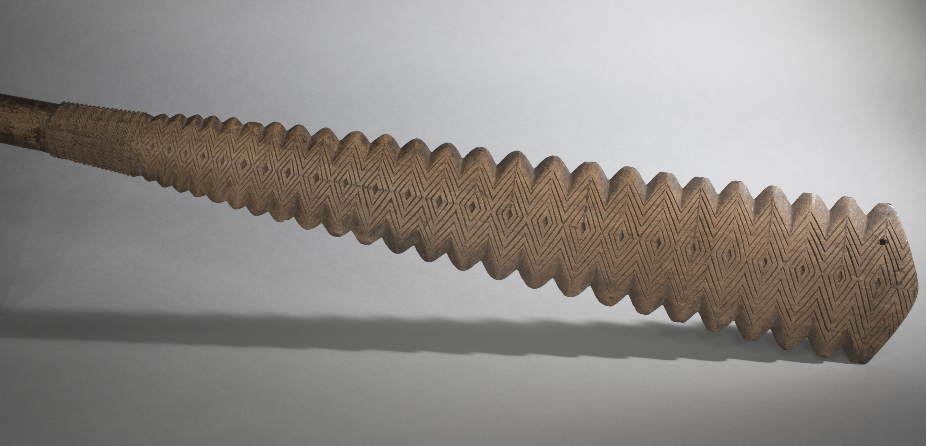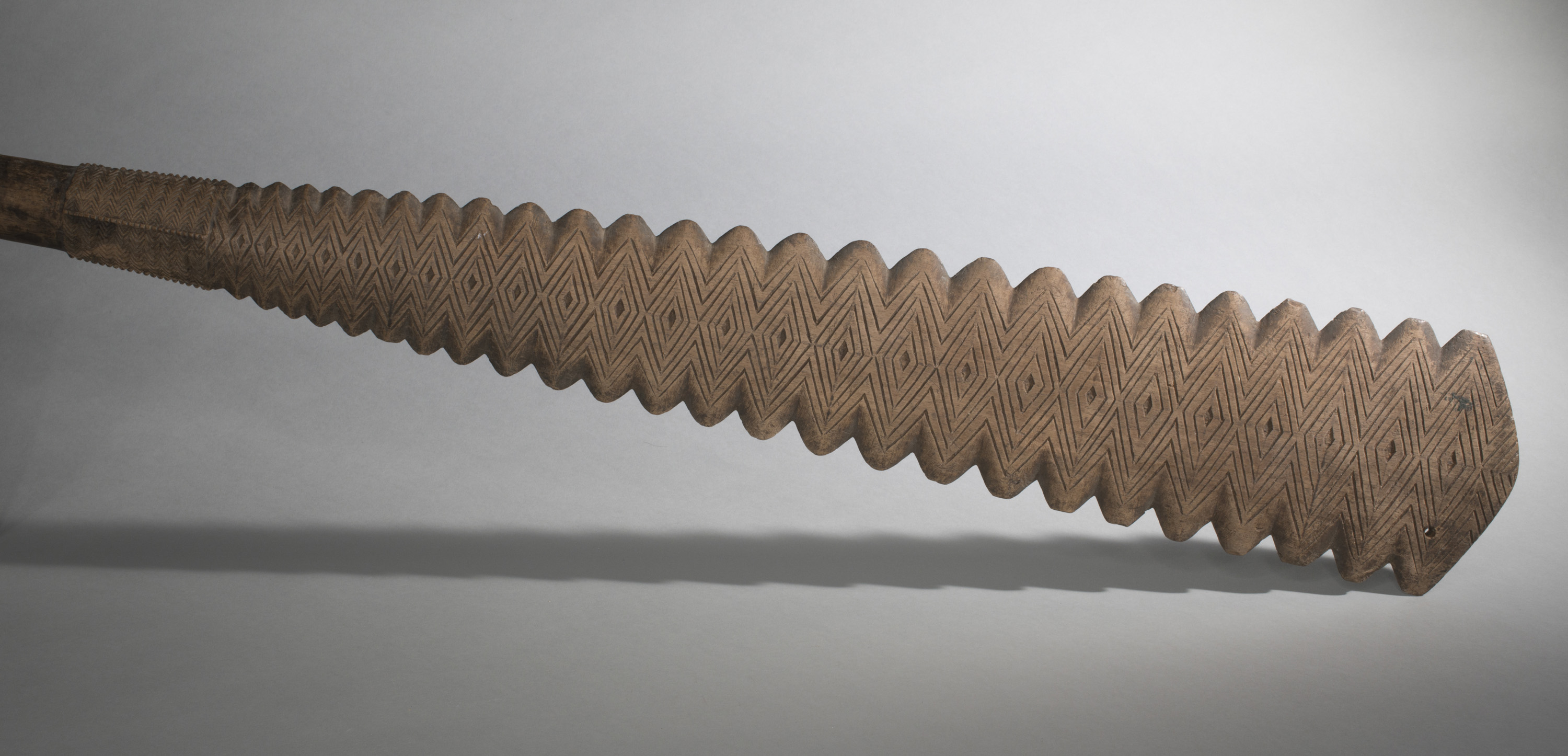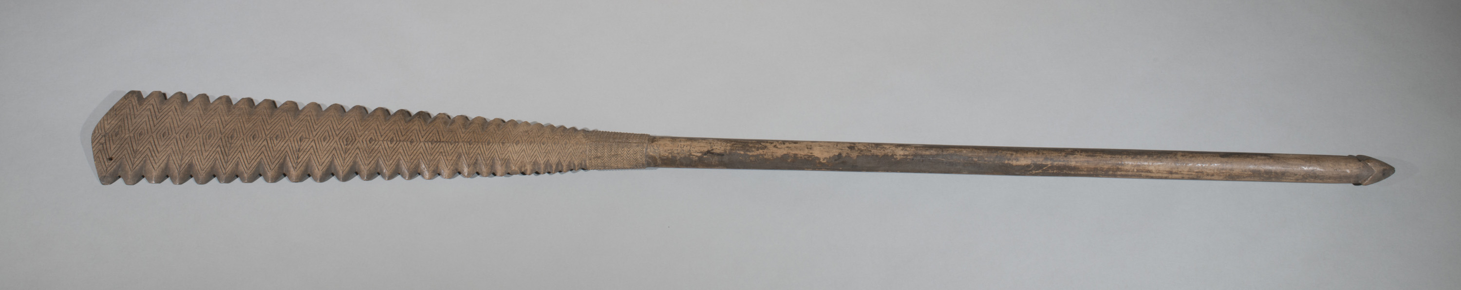 Club. Flaring spatulate toothed head and collar with chevron engraving. Butt with quadrofold terminal. From Mangaia, Cook Islands