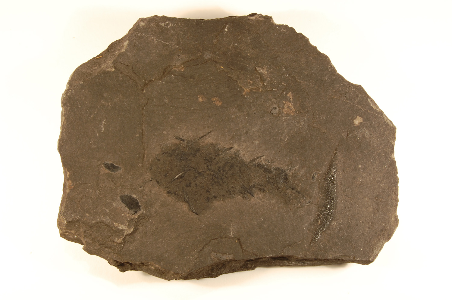 Two sides of flattened impression of acanthodian.