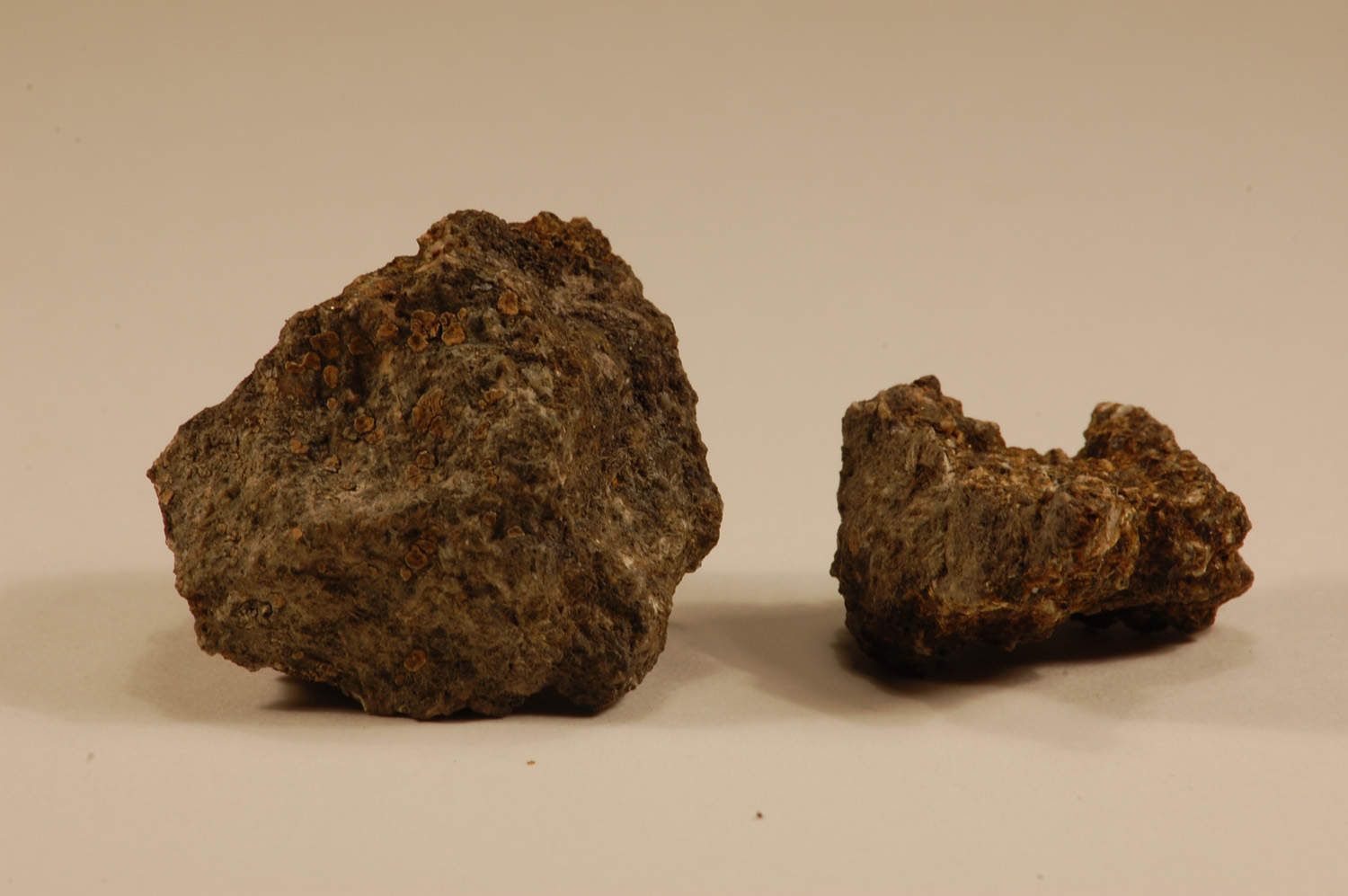 Two meteorite fragments, part of a meteorite which fell in Harray, autumn 1889, weight 180pounds. Another piece fell at Bay of Skaill.