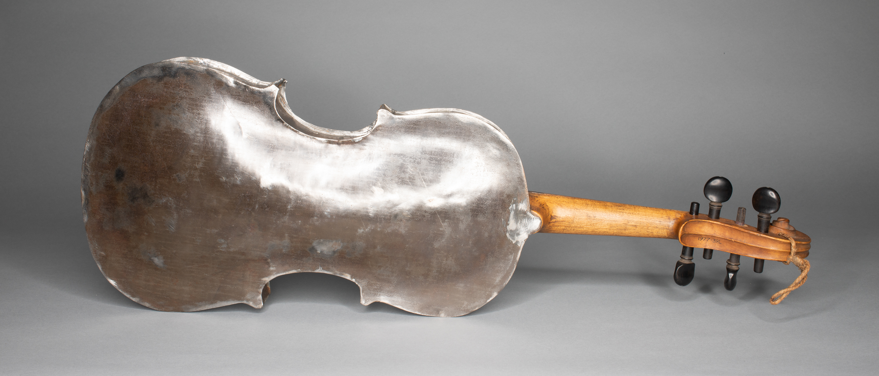 Fiddle made from tin with wooden neck. Made by a local blacksmith, James Scarth Foubister, who owned a herring fishing boat and wanted to take a fiddle on board that would not easily get broken.