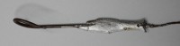 Fish hook on wire. A lead, silver coloured, moulded fish with a large brown metal hook at one end and wire attached to other end. Used for catching larger fish eg. Halibut.