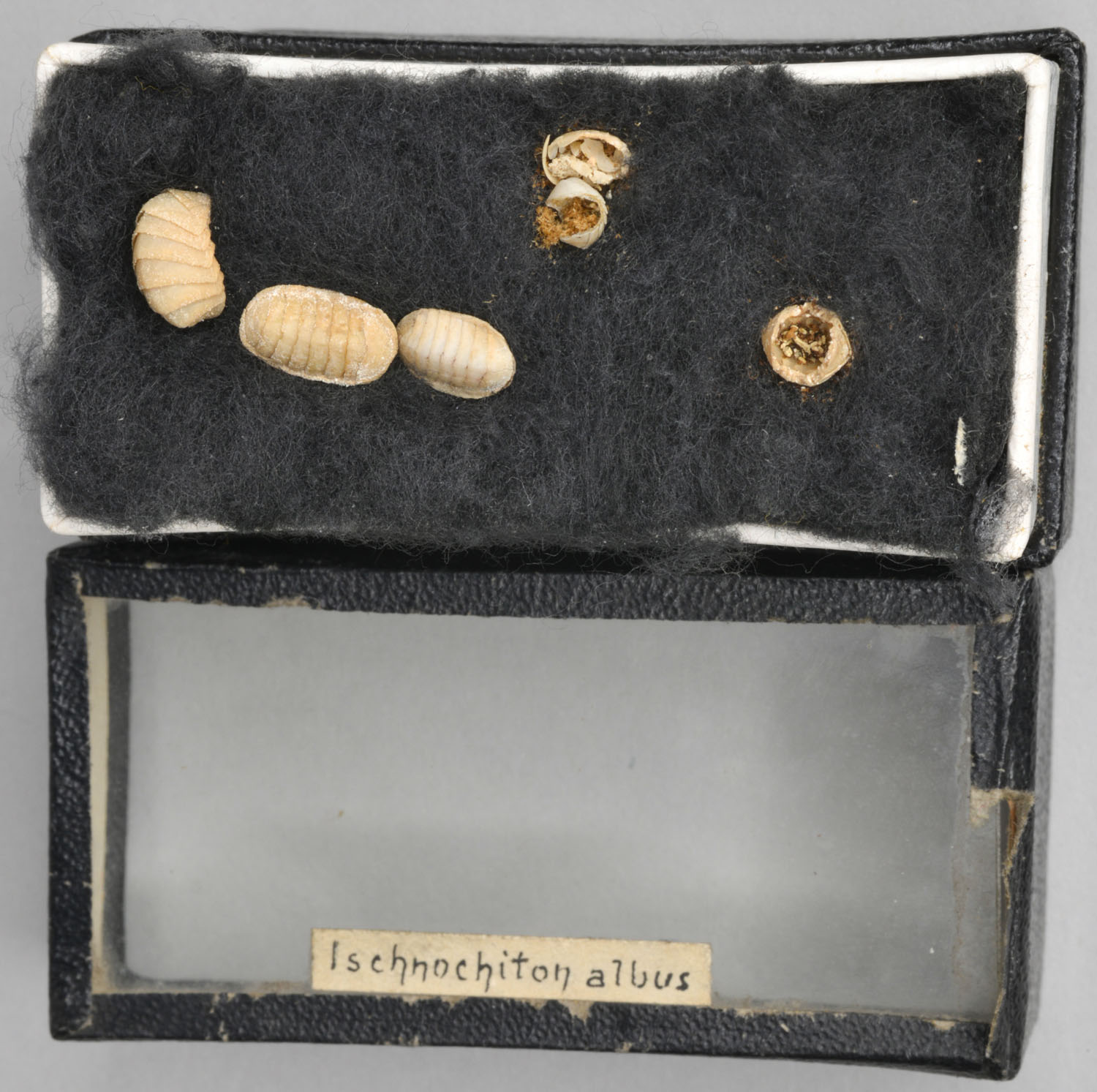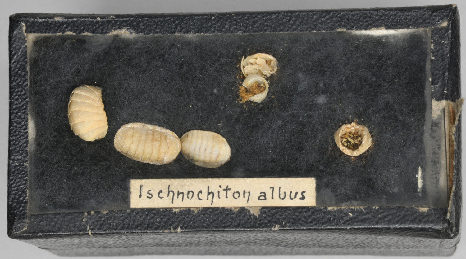Class: Polyplacophora. 3 complete specimen, 3 partial specimens. Oblong, ridged greyish white. Found on or under rocks on rocky shores.