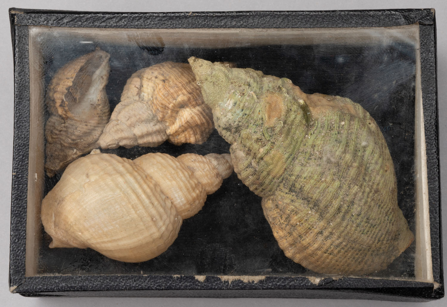 Class: Gastropoda. 5 specimens, ranging in size from small to large. Several still have their operculum intact and preserved. Conical, with well defined whorls and strong crescent shaped costae (ridges) as well as spiralling striae. Can be found most abundantly in the sublittoral.