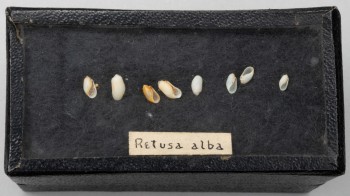 Class: Gastropoda. 8 specimens. Oval shaped with the aperture running the length of the shell. Most of its body is made up of the last whorl while the apex slightly extends up from the rest. White or off white and glossy. This species is a burrower and can be found living a few centimetres below the surface of mud or muddy sand.