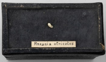 Class: Gastropoda. 1 specimen. Small and oval-shaped, white and glossy with the aperture running the length of the shell. Can be found in the sublittoral zone in muddy sand up to 1500m.