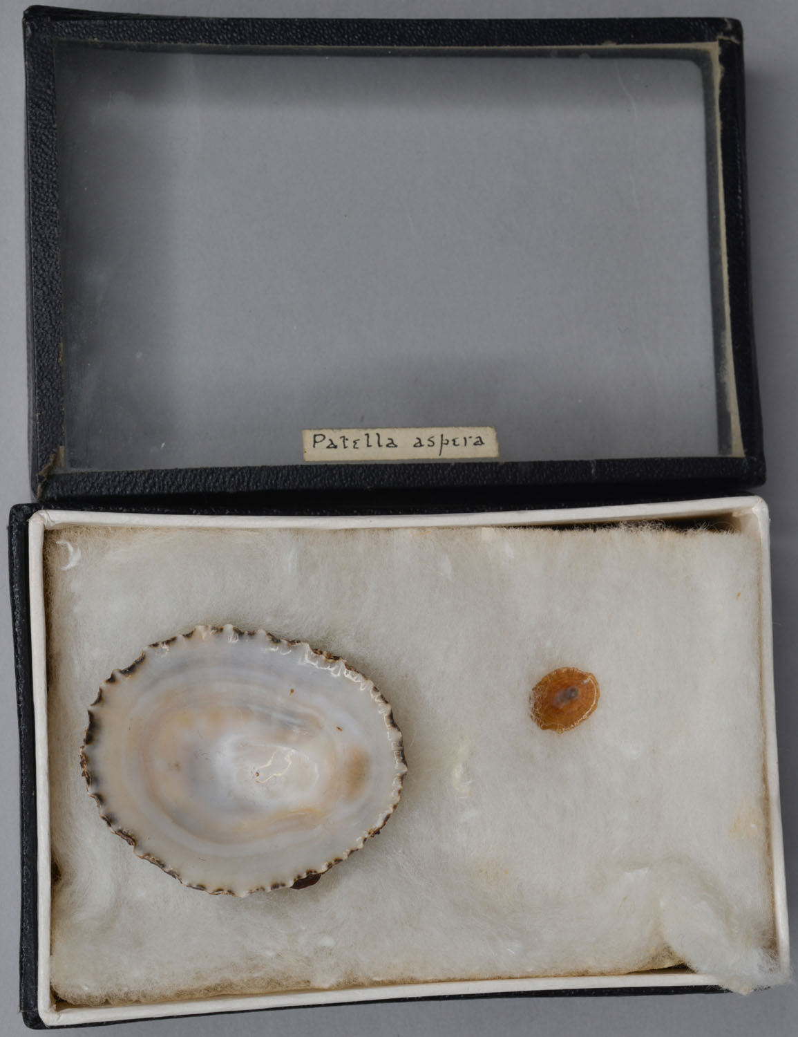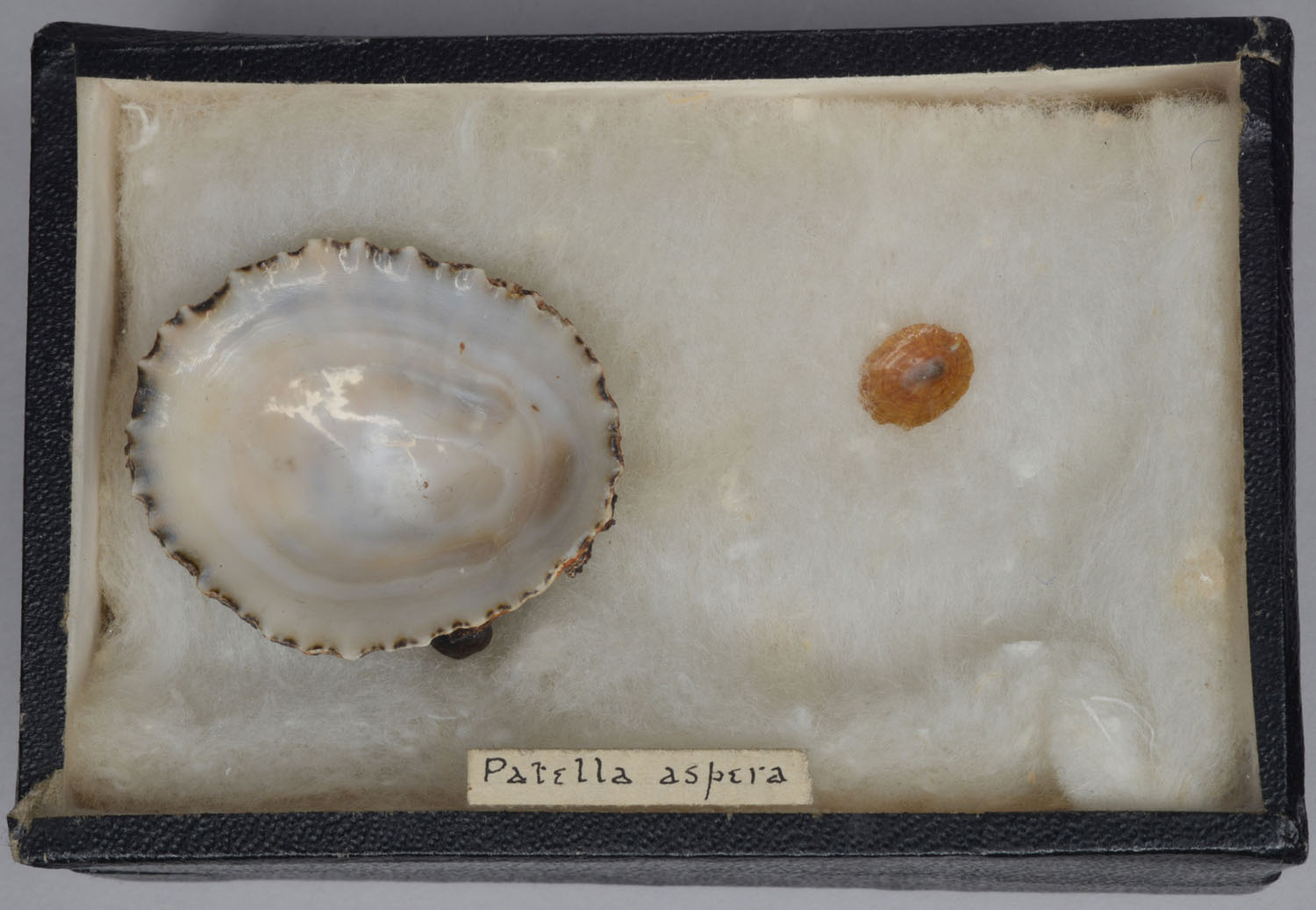 Class: Gastropoda. 2 specimens. 1 large, 1 very small and thin. Cap-shaped or conical, oval from overhead. White;cream interior on the large example, orange-brown on the small. Ridged. Can be found on rocky shores favouring rock pools and gullies.