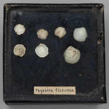 Class: Bivalvia. 7 specimens. 3 left hinges and 3 right hinges and 1 broken to the point where identifying the sides without moving it is difficult. The shells are small, white and fan shaped. They are widely distributed into the intertidal zone and the continental shelf in muddy sands to approx. 150m depth.