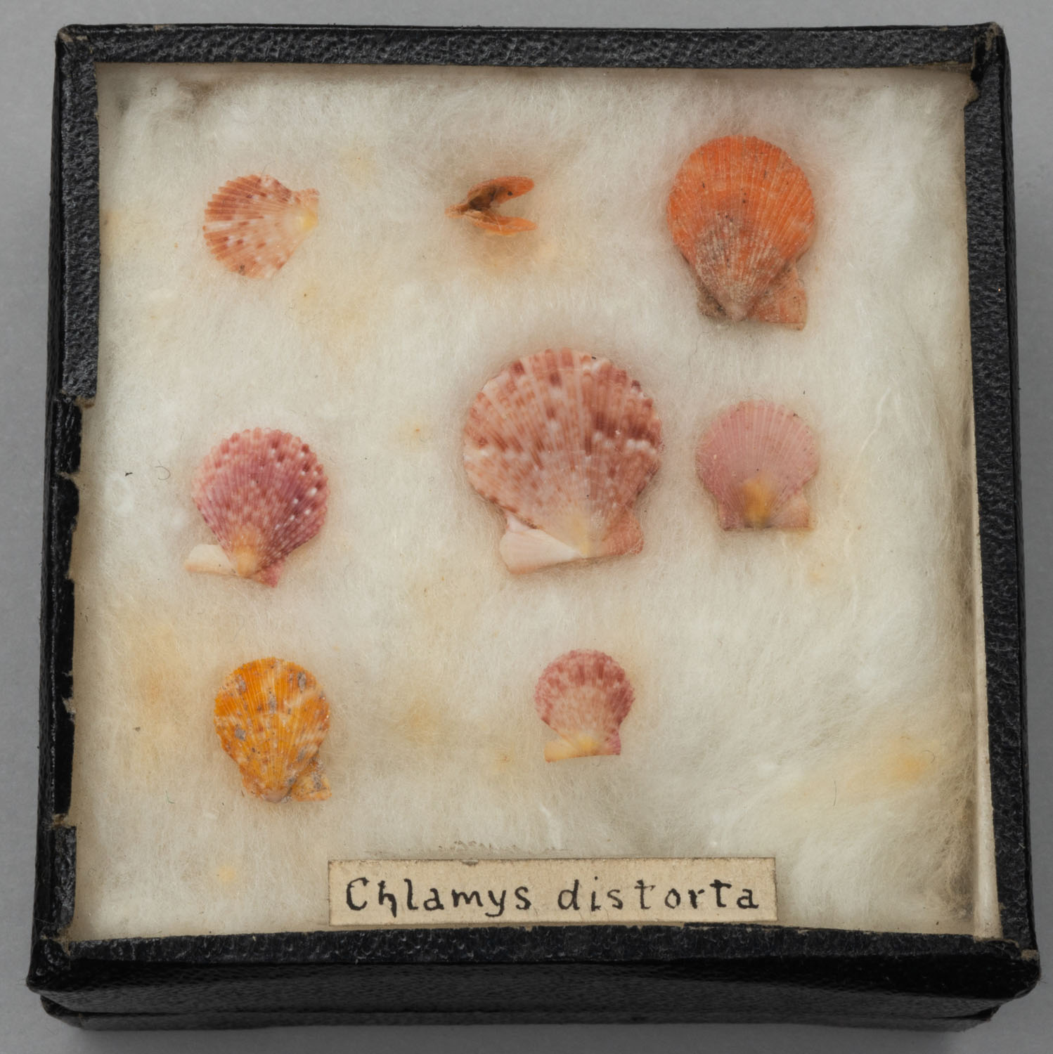 Class: Bivalvia. 8 specimens. 4 have both valves still attached, 2 individual right and 2 individual left valves, however given their differing sizes and colourings, they’ve all come from different animals. They range in colour from white to oranges and pinks and have varying patters of lines and dots. This box contains a number of different species. While some are Talochlamys pusio it also contains a number of Mimachlamys varia.