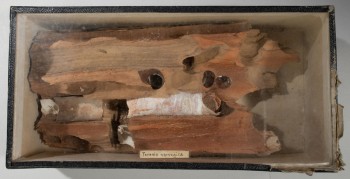 Class: Bivalvia. Contains a piece of driftwood (perhaps the piece of red pine recorded in M.O) with examples of the bore holes left by this species and the remains of at least 1 specimens.