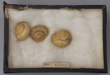 Class: Gastropoda. 3 specimens. Terrestrial mollusc. Smooth, coiled shell with 5-6 whorls. The lip of this shell is white hence the vernacular name, and the rest of the shell ranges in colour from yellow, olives and browns but these 3 specimens are yellow. Some also have banded spiral stripes. Found often in greenhouses.