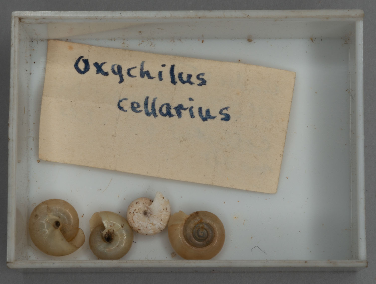 Class: Gastropoda. 4 specimens. Terrestrial mollusc. Small, translucent, flat, coiled shell. Ranging in colour from whites to yellows. Found in humid environments such as meadows and greenhouses.