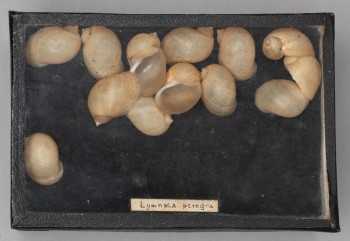 Class: Gastropoda. 13 specimens. Terrestrial mollusc. Mid sized snail, the shell has approx. 4 whorls and is thin, semi-translucent and pale yellow in colour. There are also visible but fine vertical striae. These animals can be found near slow moving or still water such as ponds.