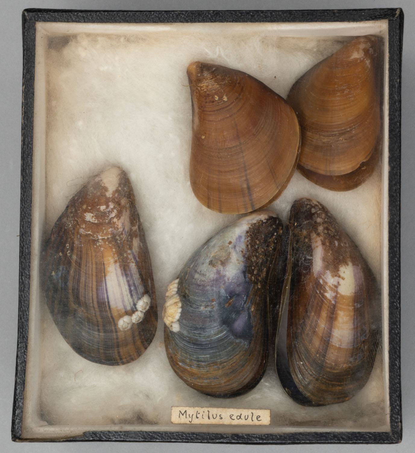 Class: Bivalvia. 5 specimens. All specimens have both valves still attached. The shells are roughly teat drop shaped and have a recognisable blue colour, however 4 of these specimens are brown in colour, possible juveniles, with radiating linear bands in dark blue. The inner surface is iridescent and glossy. They can be found in large communities attached to rocks on most rocky shores.