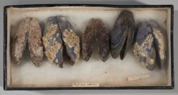 Class: Bivalvia. 5 specimens. Adults with the recognisable blue colouring. All specimens still have both valves joined. 2 have heavy barnacle epibionts of the species Chthamalus montagui. They can be found in large communities attached to rocks on most rocky shores.