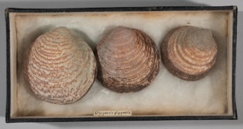 Class: Bivalvia. 3 specimens. All have both valves still connected. Large, subcircular and thick with well defined radiating growth lines. They vary in colour from whites to light purples and reds. However, they have a very distinctive and recognisable pattern of concentric zigzags. The internal surface is white and glossy. This species is a burrower and can be found in fine gravels.