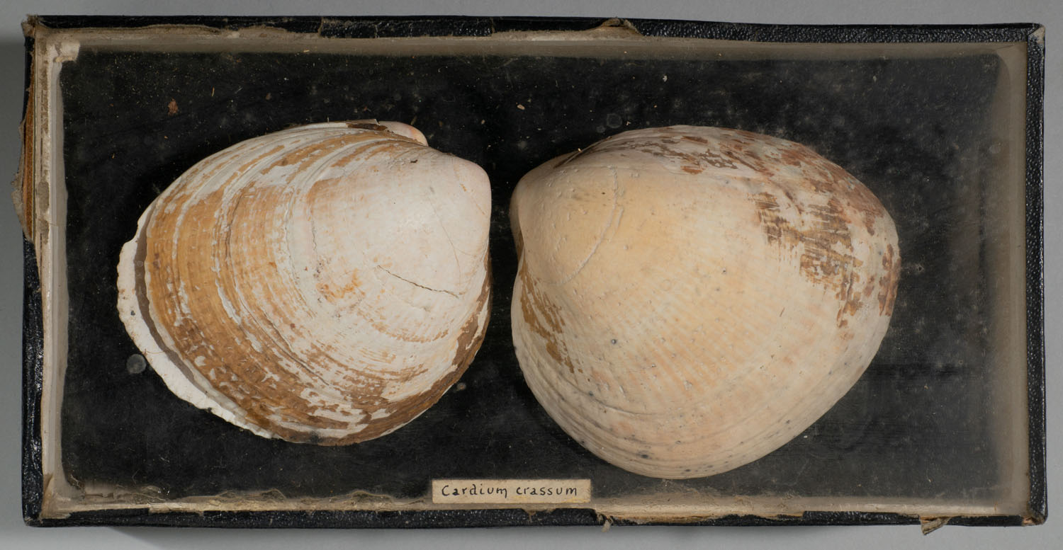 Class: Bivalvia. 3 specimens. One with both valves still attached, 1 right valve and 1 left valve that are likely from the same creature. The two separate valves are quite damaged and cracked. Large, roughly oval in shape and off white. Well defined radiating ridges as well as fairly clear concentric growth lines. Can be found in sand and shell gravel to the end of the continental shelf.