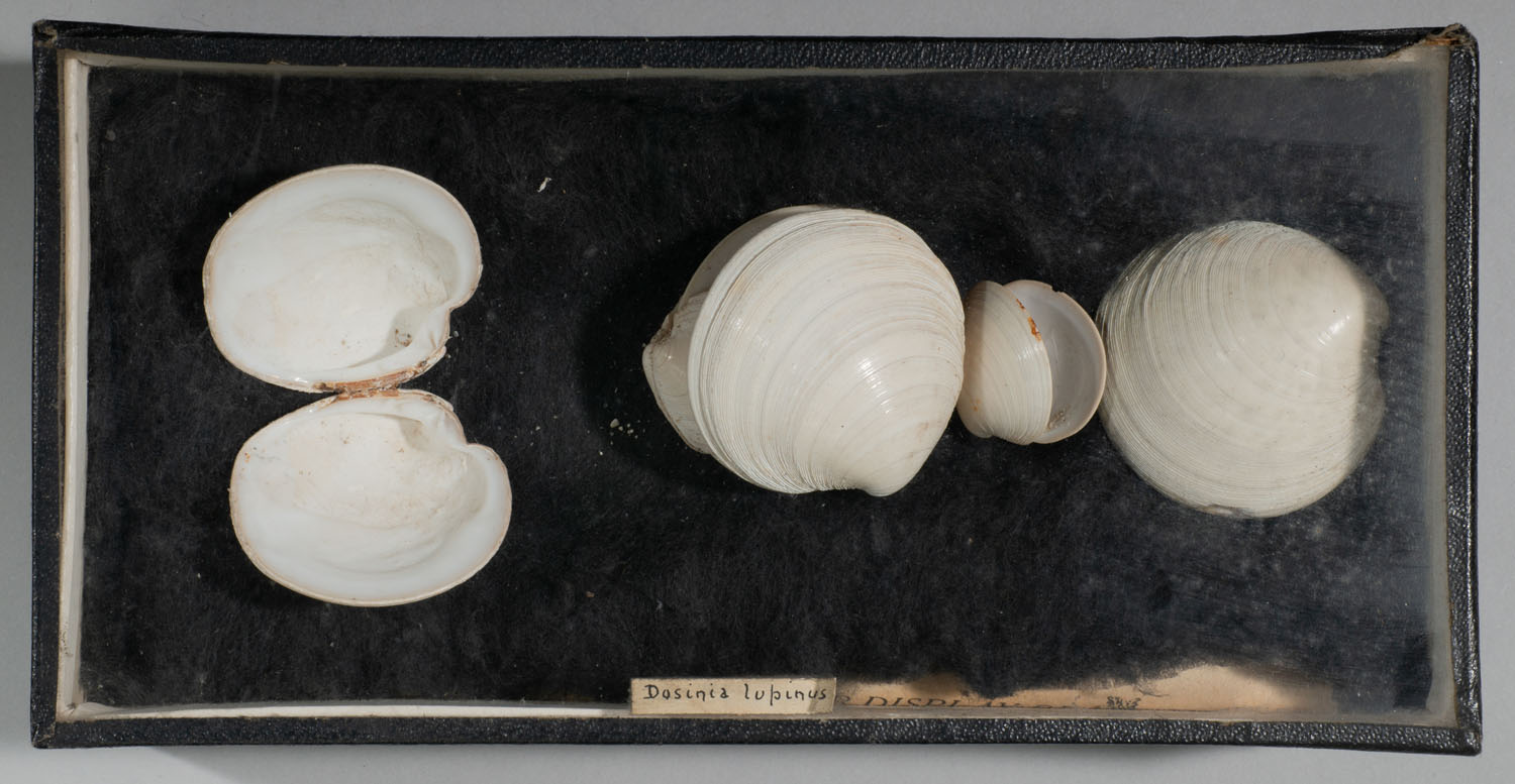 Class: Bivalvia. 5 specimens, all with both valves still attached. Subcircular in shape with many clean, well defined concentric growth lines. Interior and exterior surfaces are white and glossy. This species burrows deep into soft sediments such as sand, silts or gravel and can be found on lower shore and in the sublittoral zone.