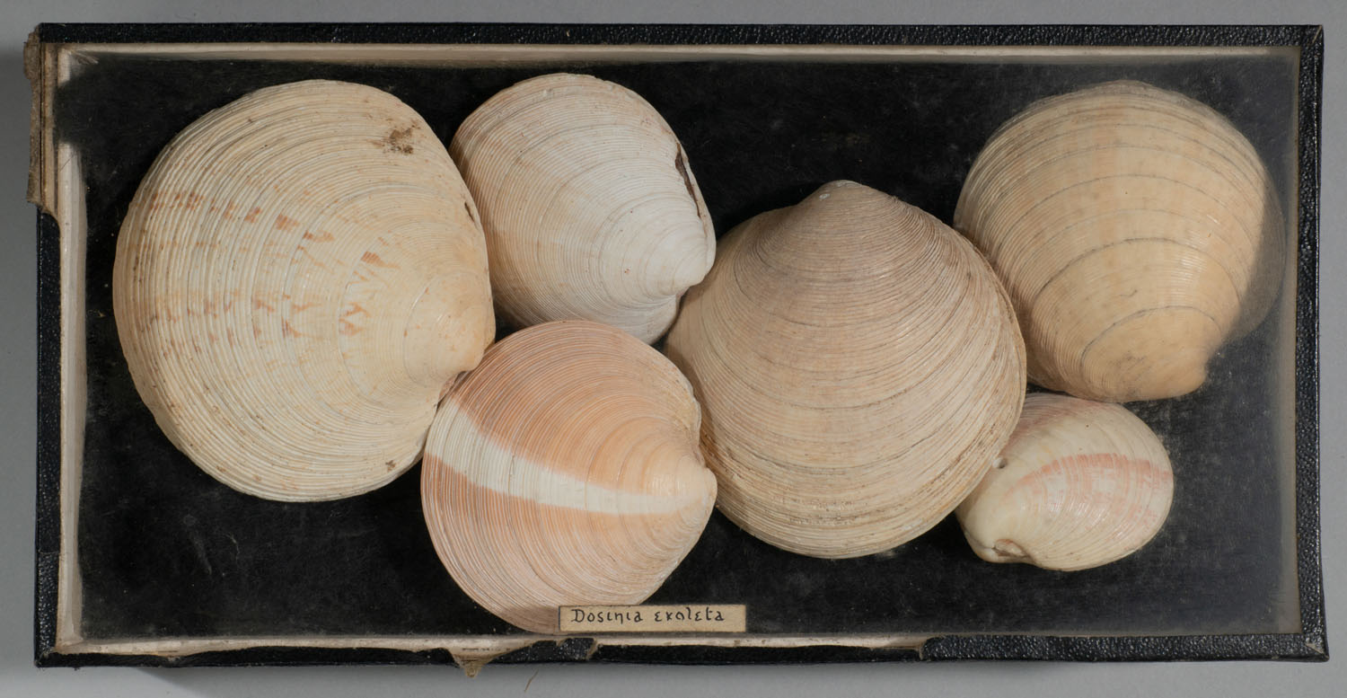 Class: Bivalvia. 6 specimens, all with both valves present and attached. Fairly large, sub-circular with many clear concentric ridges and growth lines. White or off white in colour with a small number of large bands or 'rays' of white, pink or brown radiating from the umbo. One of the smaller specimens appears to have a predation hole in its surface, potentially from a carnivorous species such as a dog whelk. This species burrows into course sand and gravels and can be found in the intertidal zone but rarely below 100m deep.