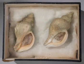 Class: Gastropoda. 3 specimens, 1 of which is held in the open display 'Orkney Shore'. All large, off white and smooth but still have their raised vertical ridges. The operculum is present in the 2 specimen which are in the box, the specimen in the open display does not.