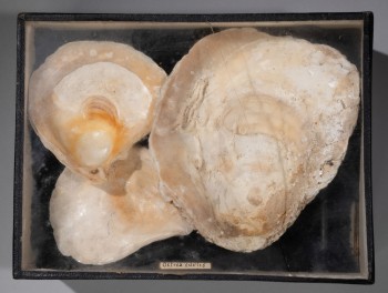 Class: Bivalvia. 3 specimens. 1 upper (right) valve and 2 lower (left) valves. The two smaller specimens in this box have an orange tinge to their internal surfaces.