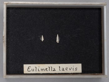 Class: Gastropoda. 2 specimens, Needle like and conical but with a blunt tip. Off white with well defined whorls of which it has 7-8. Found in muddy sands where it lives at 20-400m deep.