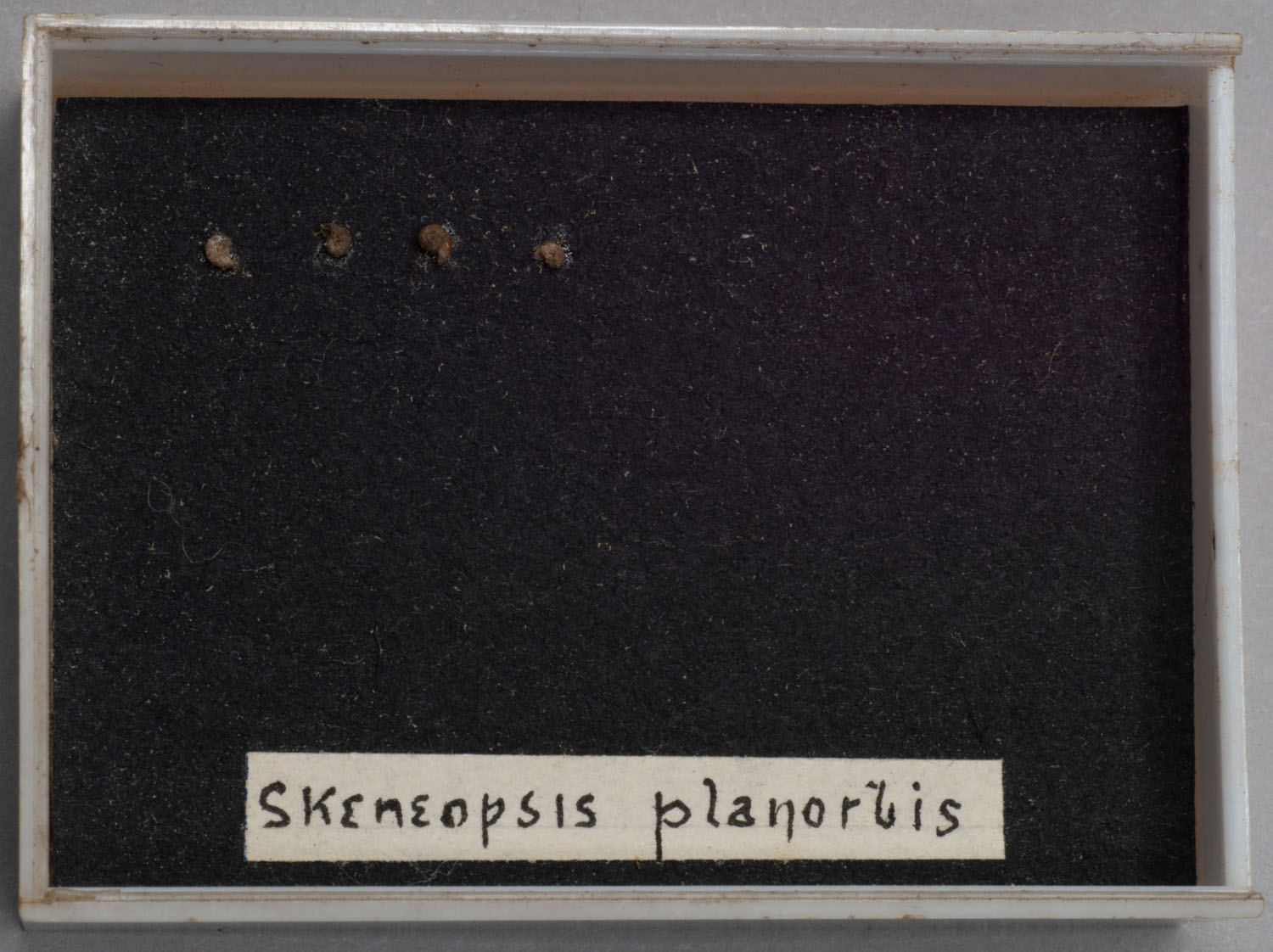 Class: Gastropoda. 4 specimens. Minute, grey, coiled shell with a slightly depressed centre spire. Can be found on fine algae and around corallines but it's rarely found in winter.