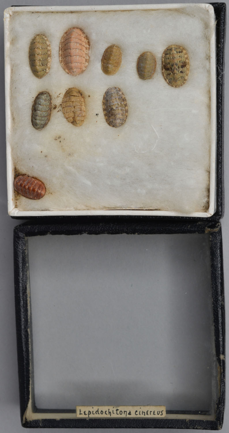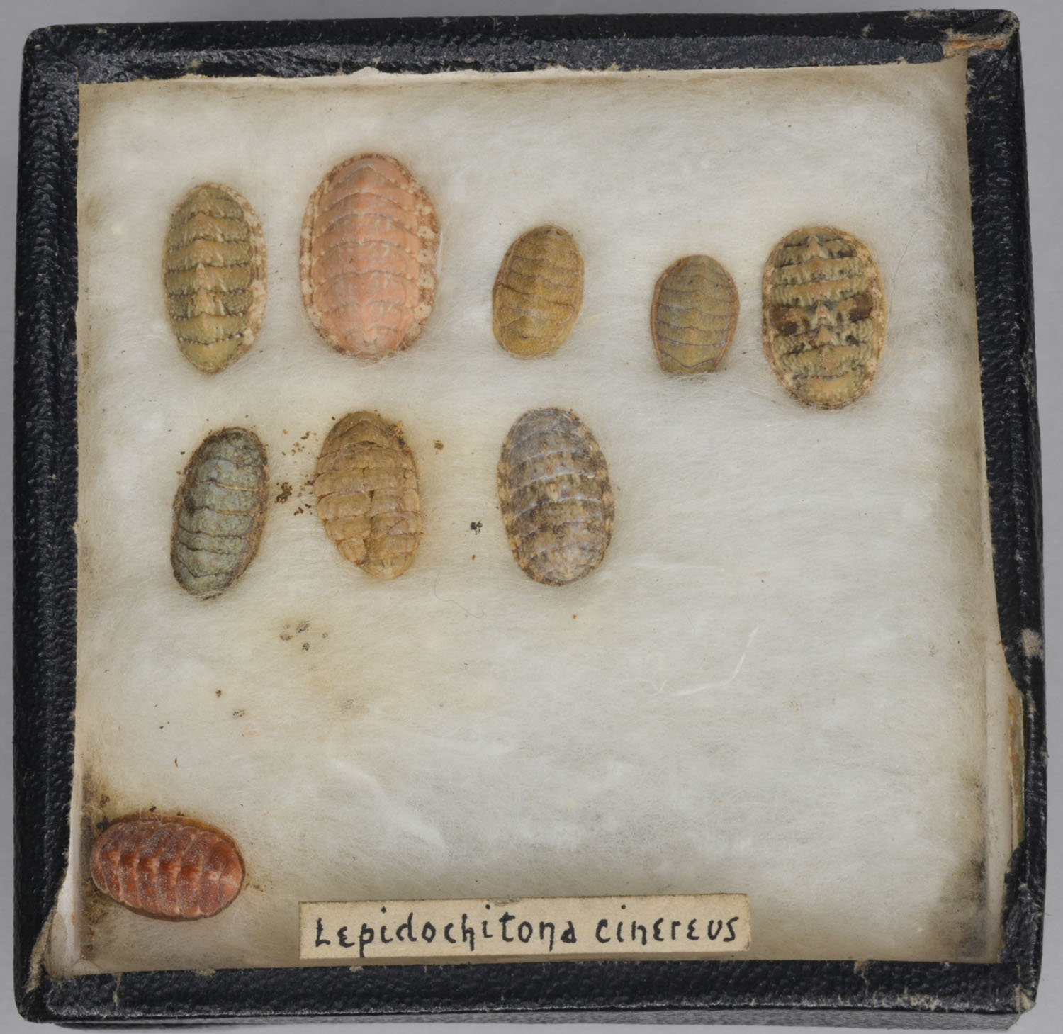 Class: Polyplacophora. 9 specimens. Oval-shaped, ridged. Pinks and greys, several have striped markings.