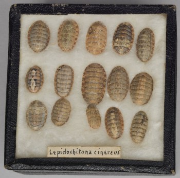 Class: Polyplacophora. 15 specimens. Oval-shaped, ridged. Mostly greys and yellowish.