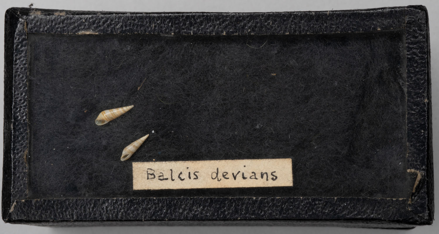 Class: Gastropoda. 2 specimens. Off white and semi translucent with spiralling pale brown bands. Conical and pointed. R.Rs identification is incorrect in this case. Confirmed by Simon Taylor as being Eulima bilineata but these particular specimens remain in the Balcis devians box.