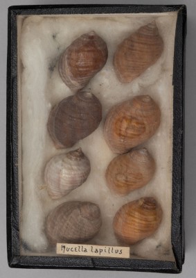 Class: Gastropoda. 8 specimens. Smaller sepcimens and with a wider variety of colours. Ranging from greyish-purple, brown and white. They are also considerably thinner than those in box 1.