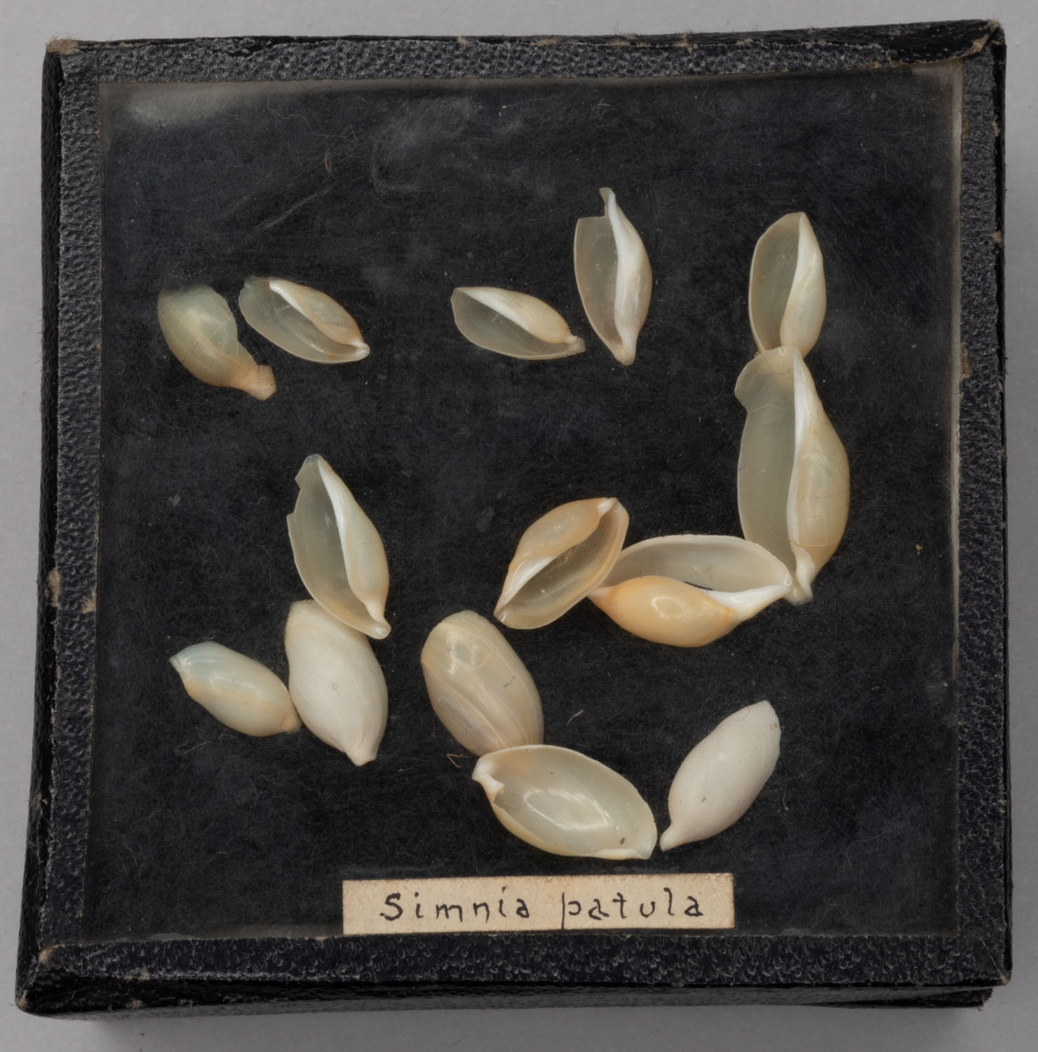 Class: Gastropoda. 14 specimens. Semi-translucent, white with an orange tinge. Elongated-oval in shape with a wide aperture that stretches the length of the shell. Can be found in the sublittoral associated with coelenterates particularly species such as Eunicella , Alcyonium and Tubularia).