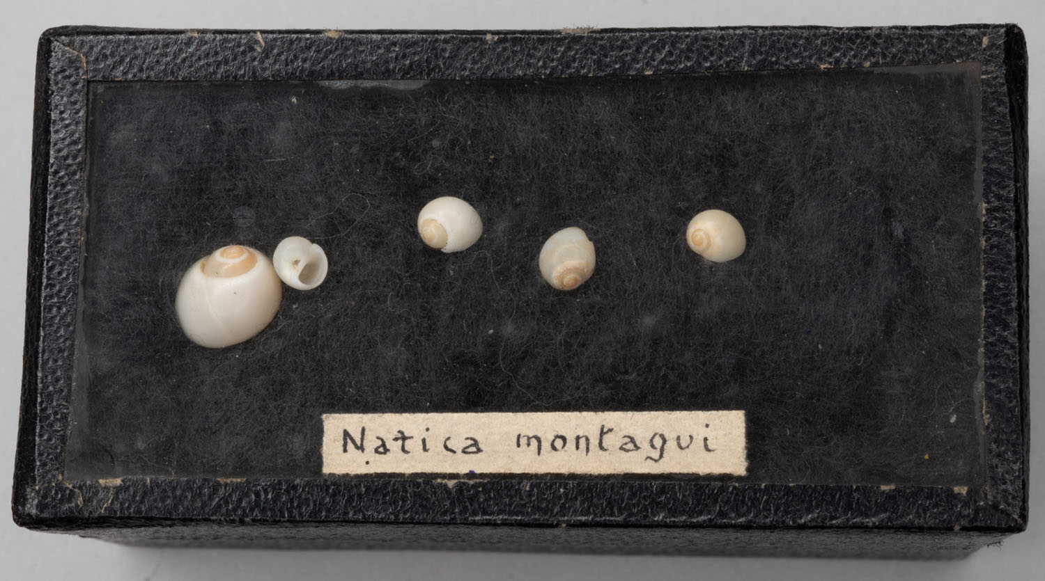Class: Gastropoda. 5 specimens. 1 Is significantly larger than the others. Off white with browner banding along the whorls. More coiled but with a slightly more pointed, extruding apex. Found in the sublittoral between 15m-200m deep.